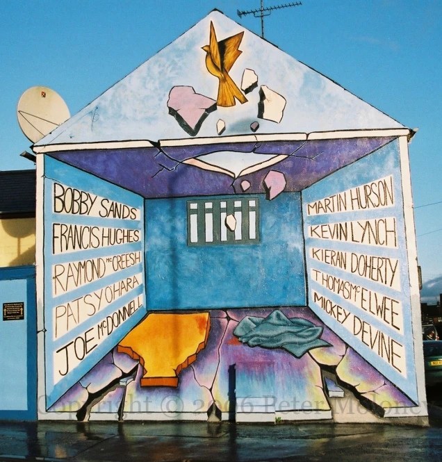 An abstract phoenix holding a ribbon bearing the first names of the first six hunger strikers: Bobby, Francis, Patsy, Raymond, Joe, Martin – IRA (Tricolour) and INLA (Starry Plough) hunger strikers.