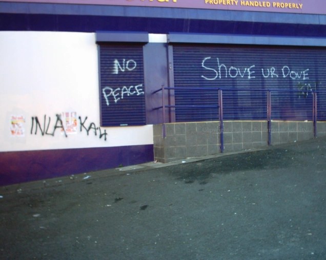 So-called “dissidents” could also use the dove to stand for the peace process that they rejected. Here are “No peace” and “Shove ur dove” graffiti at the junction of Cavehill Rd and North Circular Road.