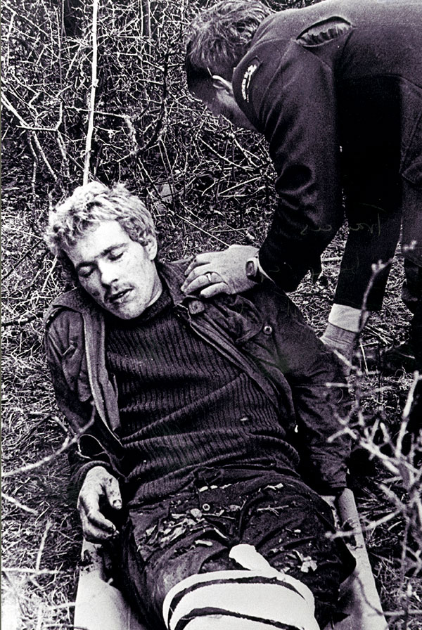 Hughes did not die at the time of this “last stand” against soldiers of the Parachute Regiment near Lisnamuck – he was captured alive (see image below) – but he would die three years later in the 1981 hunger strike while serving 83 years for killing one soldier and wounding another in the shootout, and for six years’ worth of prior offences (WP). But his eventual death is confirmed in the painting by the beret and gloves at his feet; these are typically seen on the coffins of IRA volunteers. (Here is a mural placing them in the apex of an Easter Rising mural.)