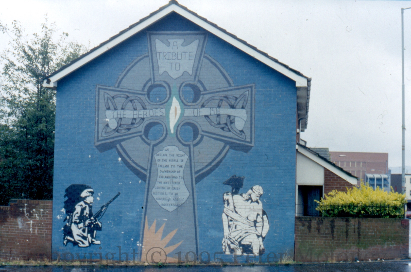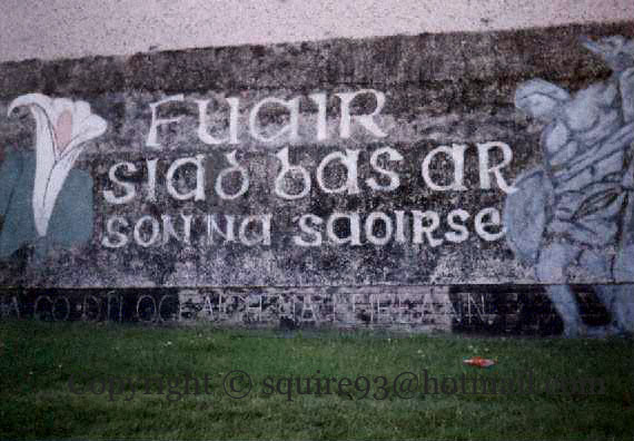 In the New Lodge, a 1916 rebel and Cú Chulaınn are placed on either side of a large Celtic Cross which sports a lily and gal gréıne (sunburst – symbol of Na Fıanna) and a line from the Proclamation.