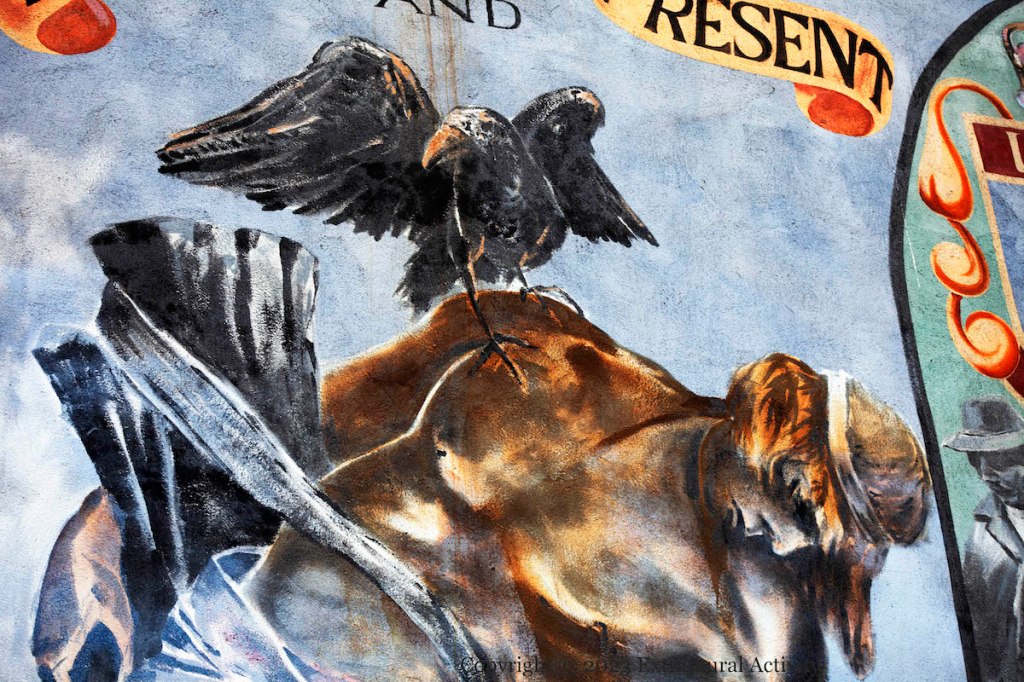 The Highfield rendition shows a sacrificial version of the Dying Cú Chulaınn, without shield or sword (and tied not to a rock but to an upright log or broken-off tree-trunk (or cross??)). Despite the lack of weapons, the context is still present-day paramilitarism: this is a UDA mural – with two images to the right of volunteers with sunglasses (above) and balaclavas (below), though no weapons are depicted.