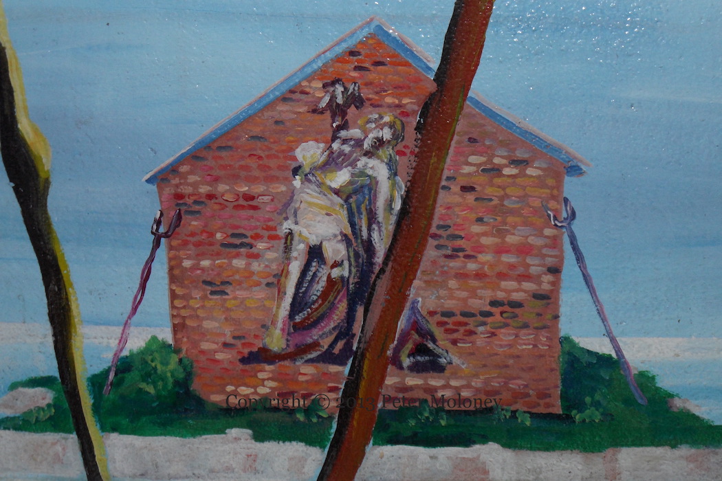 The sacrifice of the hunger strikers is represented directly by the Christ (and Mary). One mural showed hunger strikers on the cross (see T00048). Another invokes the pietà directly: a dead hunger striker lies in the arms of his parents having been removed from the suffering-place that is “Long Kesh 1981”