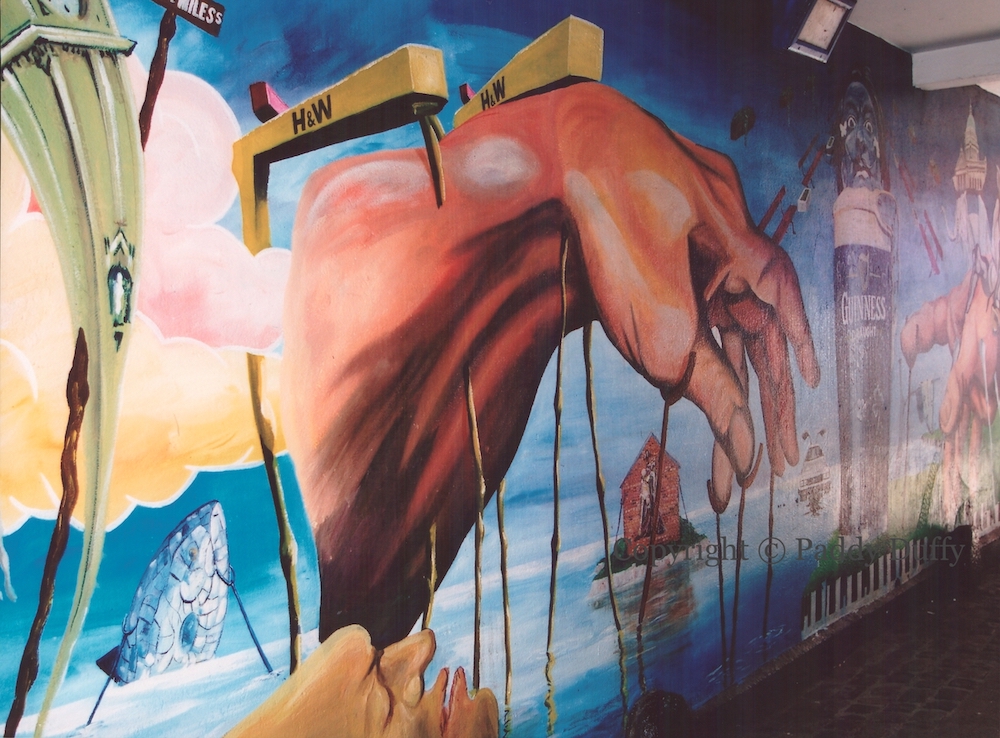 Cú Chulaınn painted on a bare brick wall appears in the Salvador Dali mural in the Commercial Court entryway to the Duke Of York and Dark Horse bars. There is no such “bare” mural of Cú Chulaınn – this portrayal is meant to stand for all of the Cú Chulaınn murals, or perhaps all of the CNR ones. The mural combines various Belfast landmarks as floating fragments of memory in the disconcerting Dali style – perhaps brought on by the massive pint of Guinness from above which Dali shoots laser beams from his eyes. Jim Larkin also appears (T00769), on the other side of the central pint, perhaps specifically the statue in Donegall Street Place.