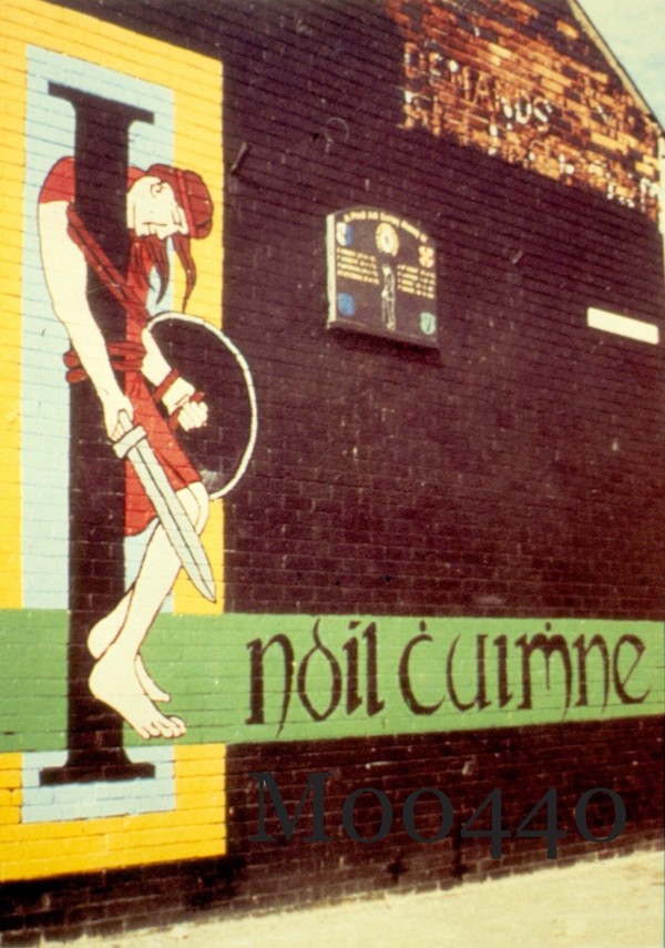 Mo Chara (and others) painted the 1991 Cú Chulaınn Cróga in Armagh, below, which does not make any reference to either dead volunteers or dead locals from either end of the 20th century. Nor again did it refer to active volunteers. The title (behind the bin) and the title in the apex are from Pearse’s Mıse Éıre but the mural lacks any pictorial reference to subsequent resistance. Mo Chara’s 2005 Glenbawn Cú Chulaınn (X02580) is also purely cultural, as is the 1990 montage (perhaps depicting the Táın Bó Cúaılnge) in north Belfast (M00898).