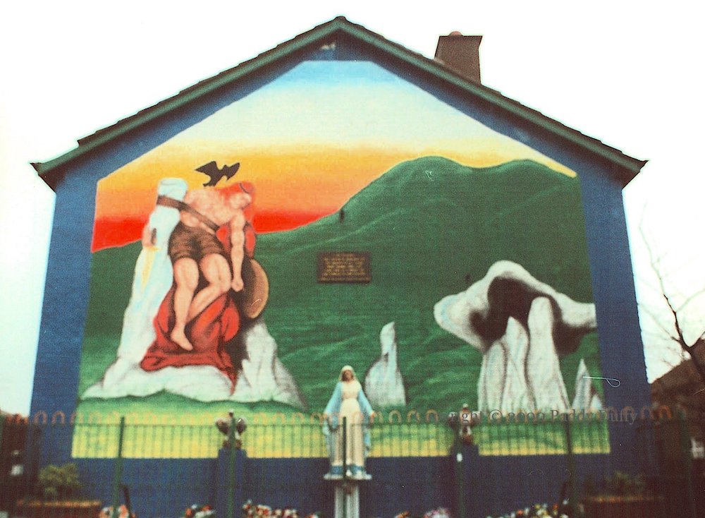 The ancient hero Cú Chulaınn – and more specifically, Oliver Sheppard’s depiction of the death of Cú Chulaınn – has appeared in both republican and loyalist murals.