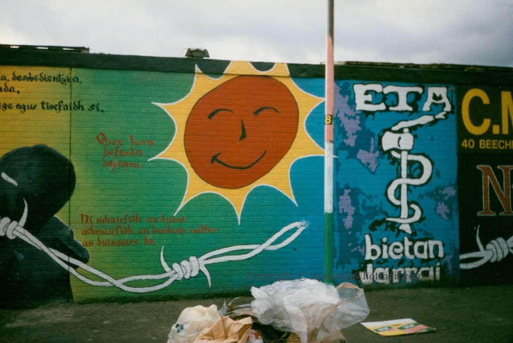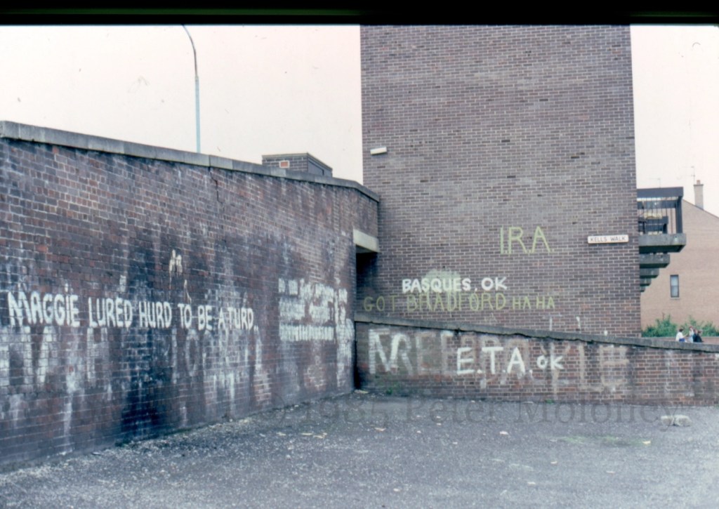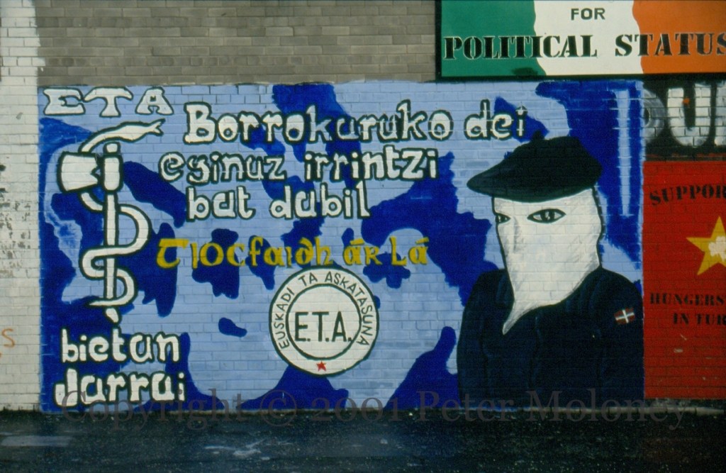 “Basques OK” and “ETA OK.” The Spanish constitution of 1978 makes the Basque country an independent “nationality” with Spain, but many in the region reject the constitution. ETA is Euskadi Ta Askatasuna, which at the time was waging an armed campaign. Bogside, Derry.