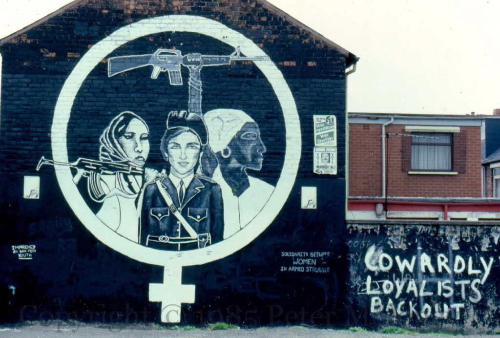 “Solidarity Between Women In Armed Struggle.” Female volunteers from the PLO (Palestine Liberation Organization), Cumann Na mBan, and SWAPO (Southwest African People’s Organization, from Namibia). Middle Falls, west Belfast. (2)