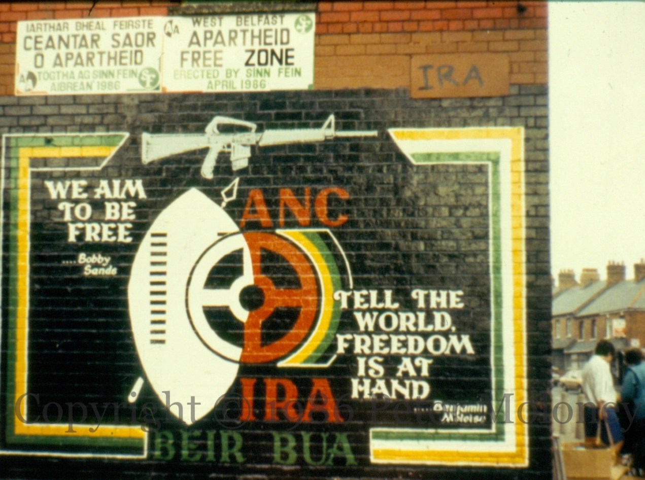 The ANC is the African National Congress, a South African group banned until 1990. Moloise was executed by hanging in 1985. Beechmount, west Belfast. (3)