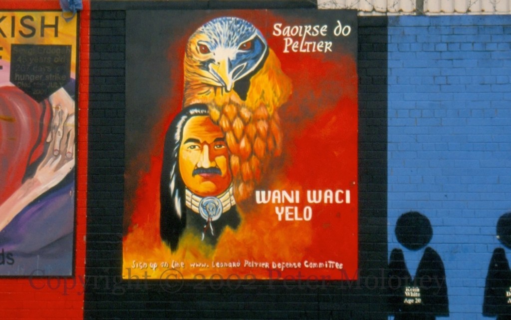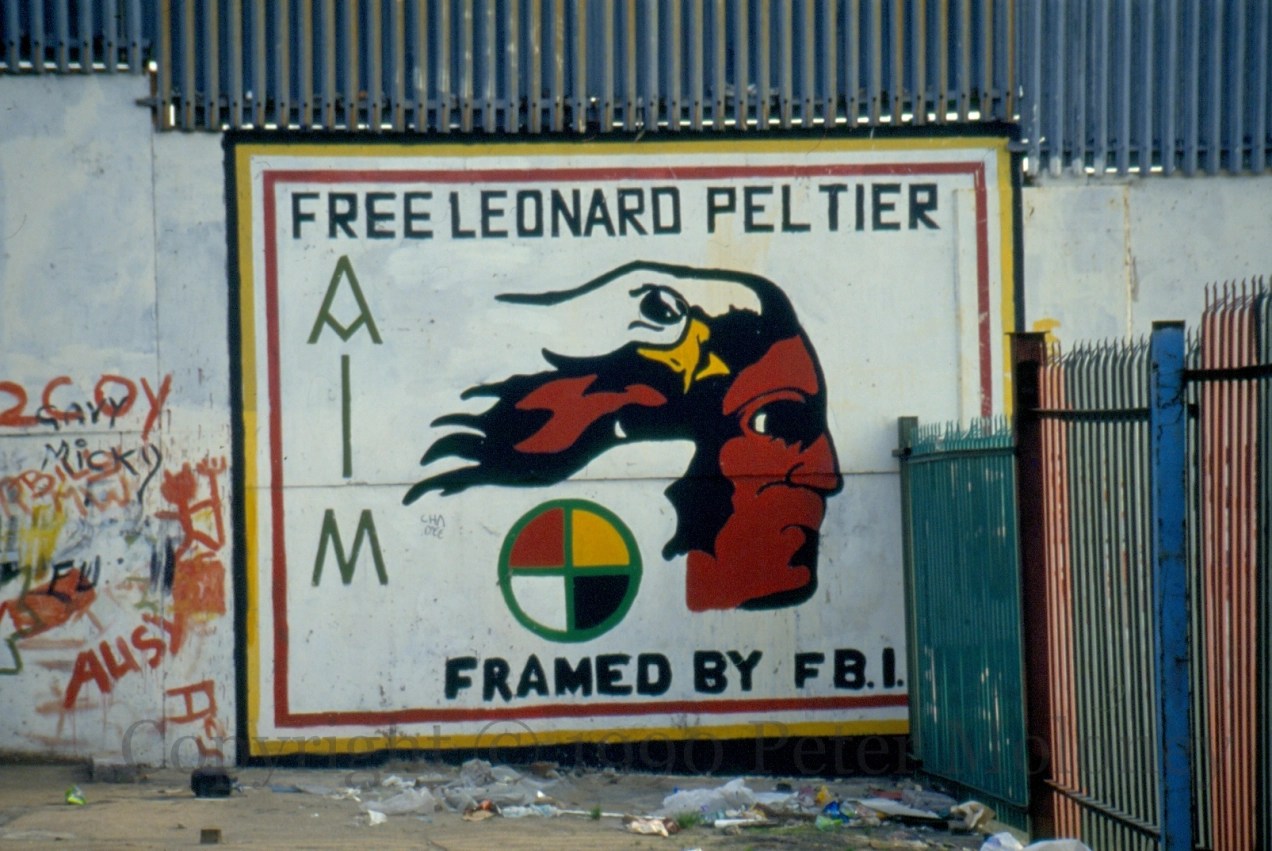“Free Leonard Peltier” AIM (American Indian Movement) member Leonard Peltier was convicted in 1977 of the murder of two FBI agents at Pine Ridge reservation. (5)