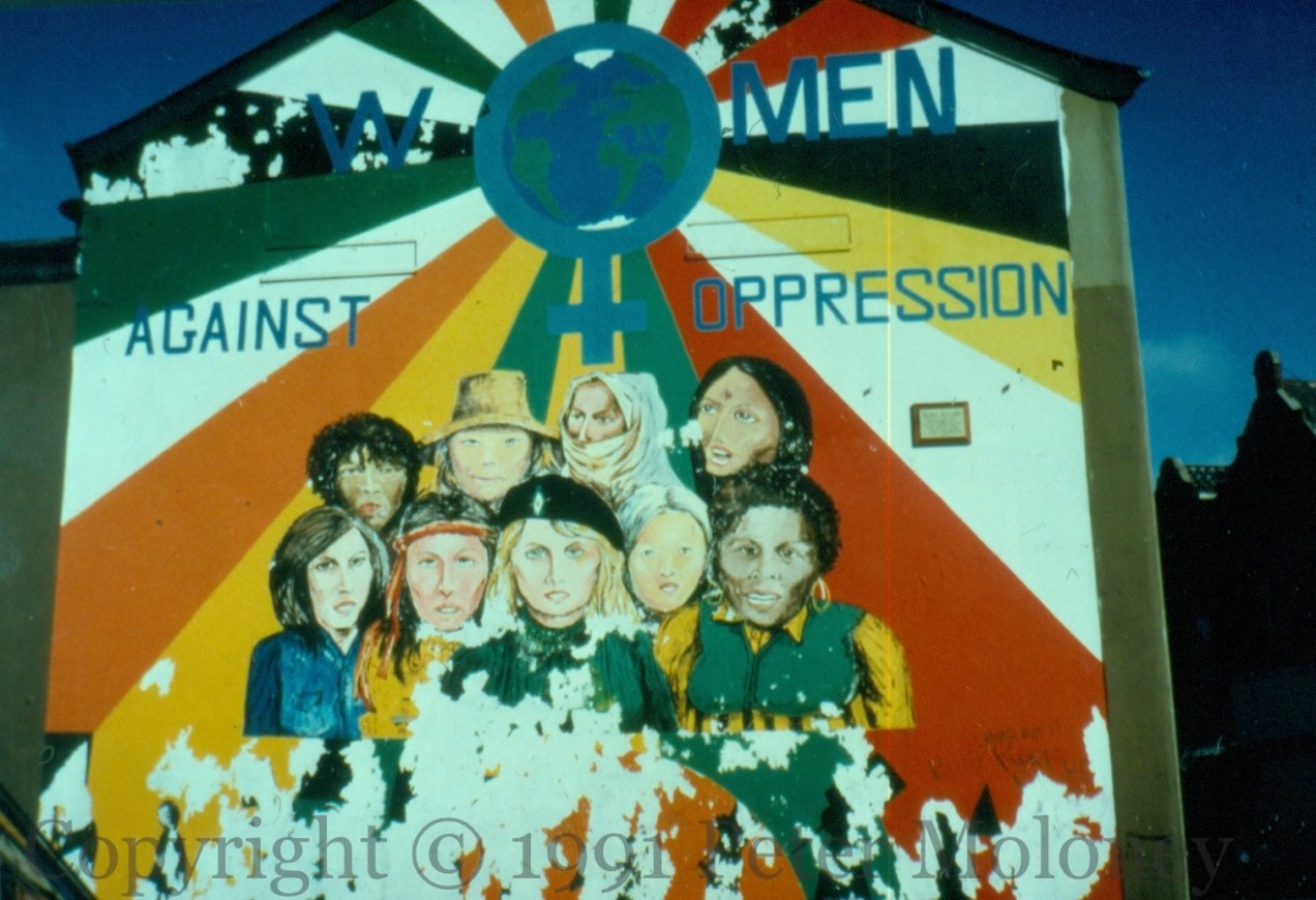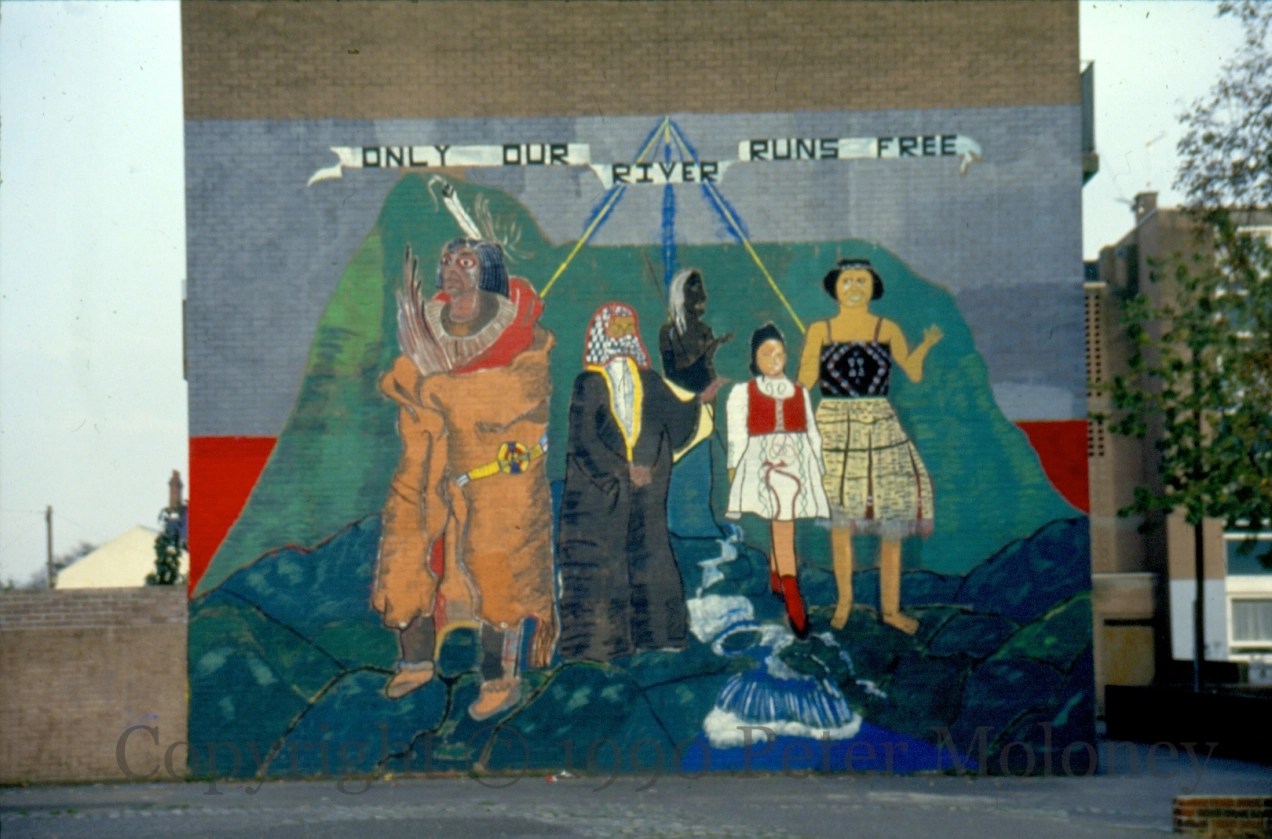 “Only Our River Runs Free”. Women of various ethnicities: Native American, Palestine, ?, Irish?, and Mexican?. Unity Flats, Belfast.