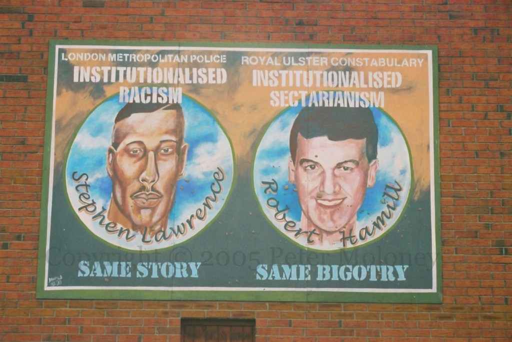 Londoner Stephen Lawrence was murdered by stabbing in 1993 and, although arrests were made, no charges were brought. A 1998 public inquiry found that the Metropolitan Police Service was “institutionally racist”. In 2012, two of the original suspects were found guilty of the murder (WP). Catholic Robert Hamill was beaten to death by loyalists in Portadown in 1997 while police in an RUC land-rover looked on (WP). Ardoyne, north Belfast.