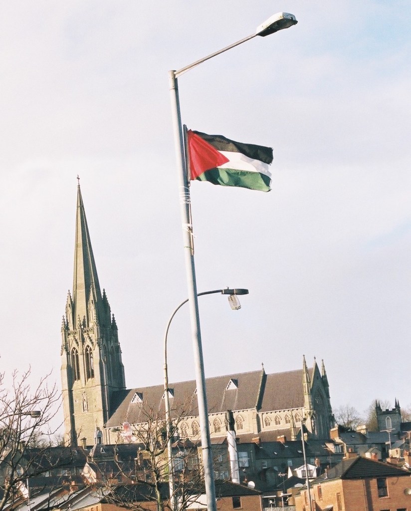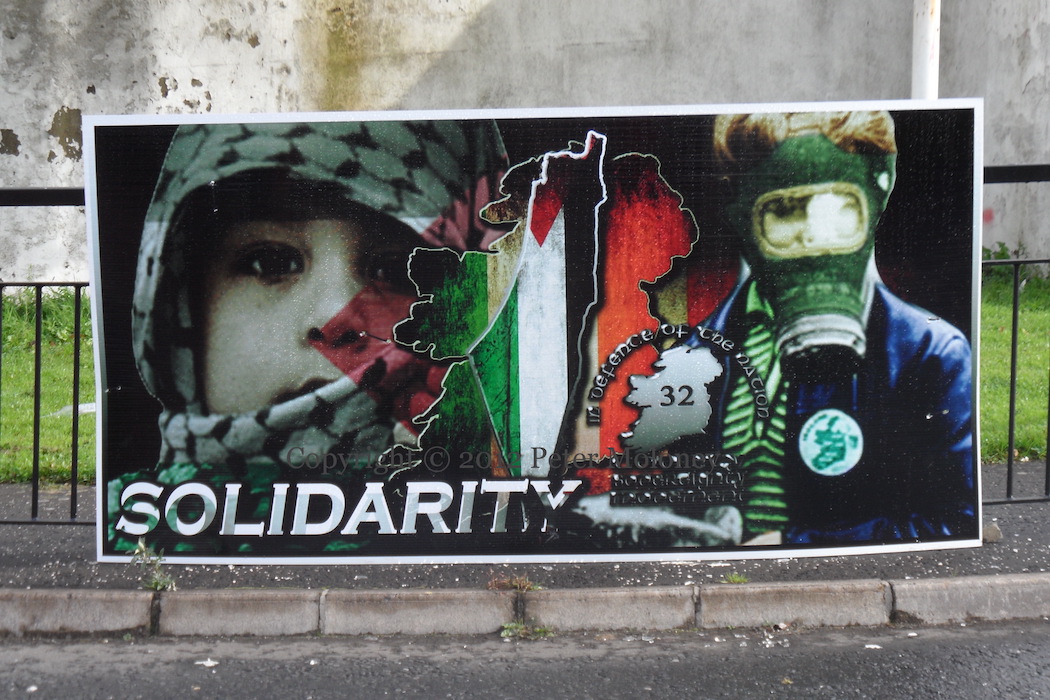 32CSM placard expressing “solidarity” with Palestine. Lecky Road, Derry.