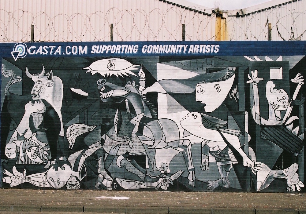 Guernica, reproduced as a mural, depicting the Nazi bombing of the Basque town Gernika during the Spanish Civil War. The International Wall, Divis, west Belfast.