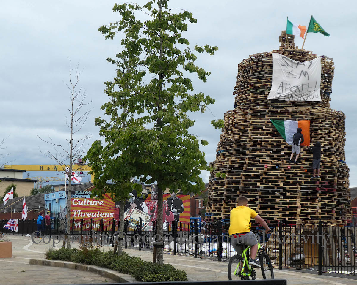 “Active service” on paramilitary plaques means death by a premature bomb explosion rather than at the hands of enemy forces. All three of the IRA volunteers named here died in this way: Paul Fox in King Street in 1975, Sean Bailey in nearby Nansen Street in 1976, and Paul Marlowe on the Ormeau Road later that same year (Sutton). The central plaque (shown below) has been in place since at least 2006 but was augmented last year with portraits. The fourth is Tony Campbell, also from the 2nd battalion, dead by natural causes in 1985.