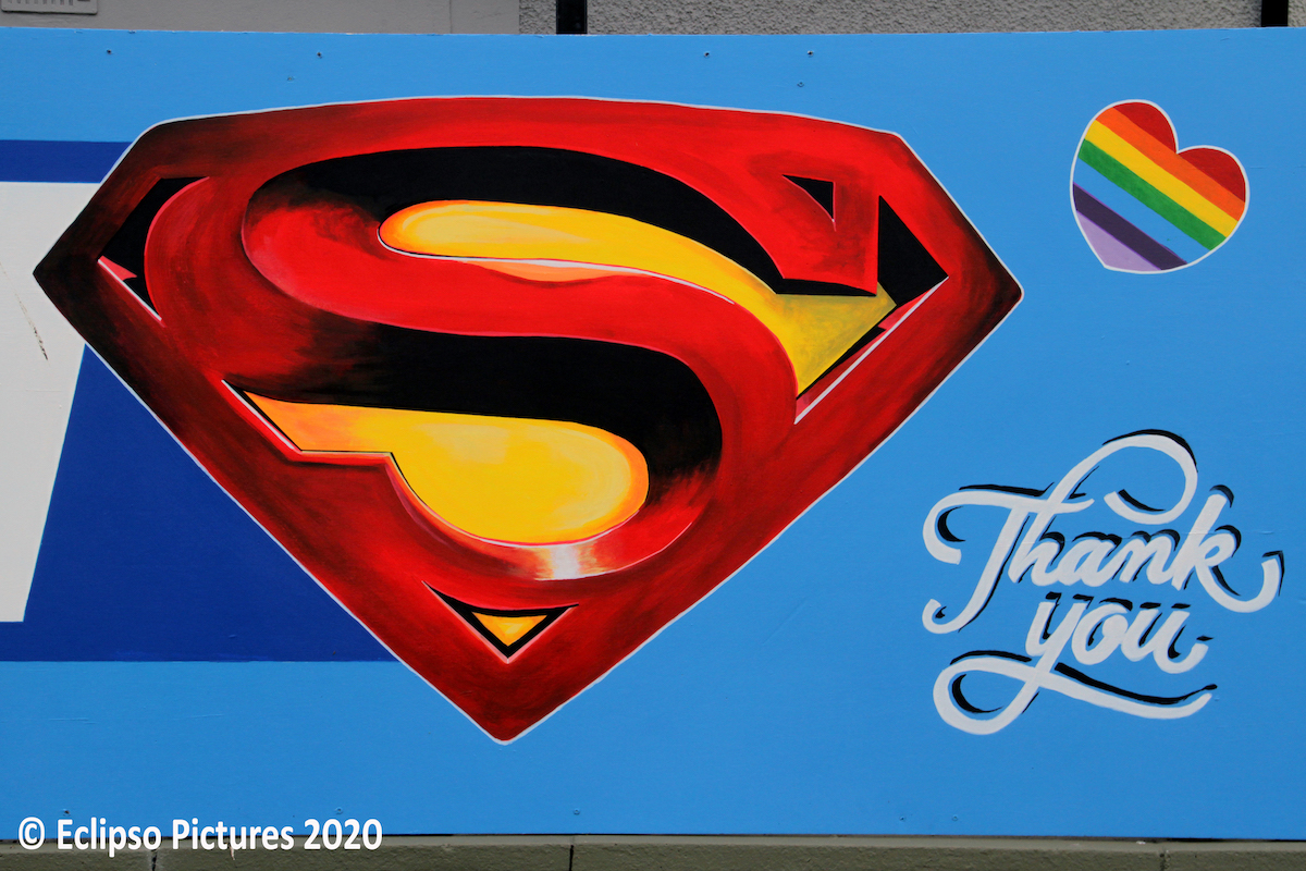 This is the pro-NHS mural in Newbuildings, south of London-/Derry. The “S” of NHS has been turned into the “S” of superman (see also Prepared For Work, Ready For Coronavirus). The rainbow (7-stripe rather than the gay pride 6-stripe) has become a symbol of positivity in the time of the coronavirus pandemic (see e.g. NHS Forever | Thank You, Postmen).