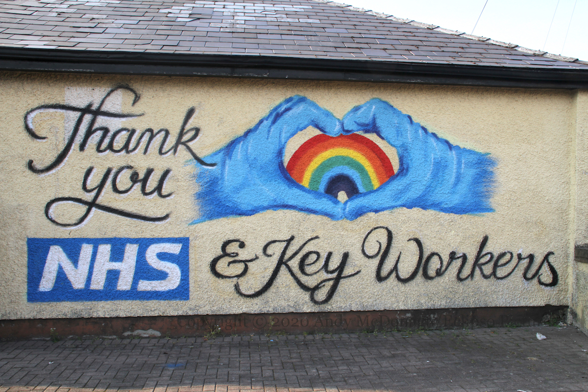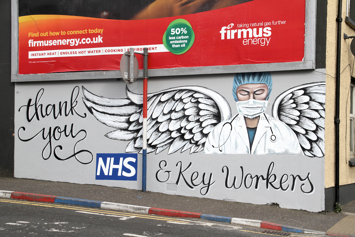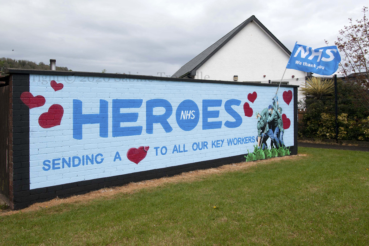 Three of the six Marines who raised an American flag on Iwo Jima in February 1945 – made famous by a photograph Joe Rosenthal – were killed in the battle. The soldiers in this new Glynn mural are planting the flag (a real flag) into a mass of coronavirus molecules, hopefully protected by their surgical masks and gloves. “NHS heroes. Sending a <heart> to all our key workers.”