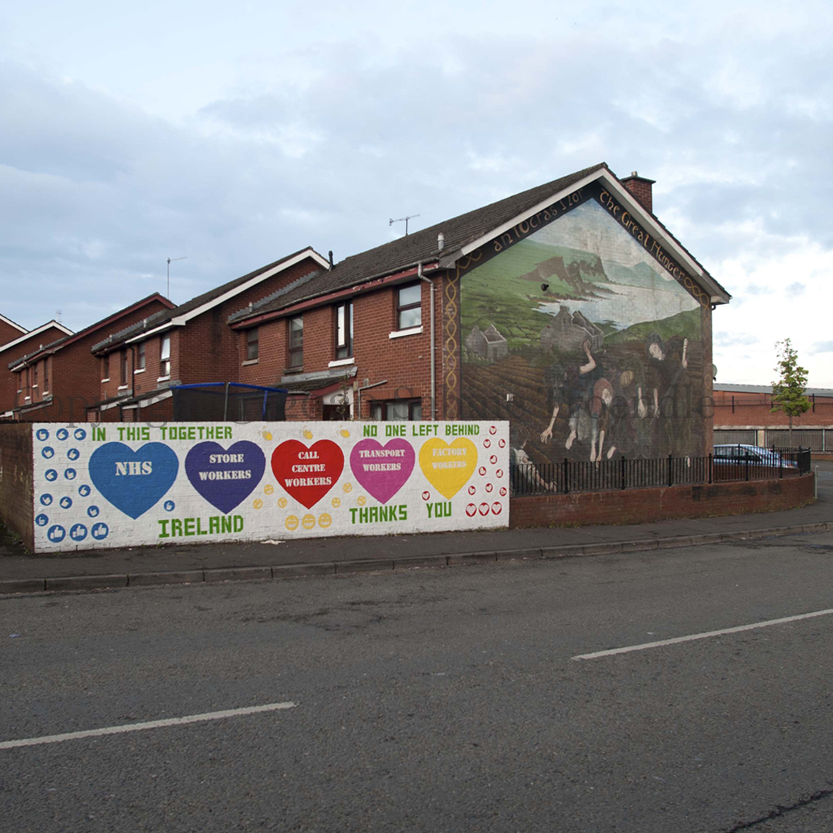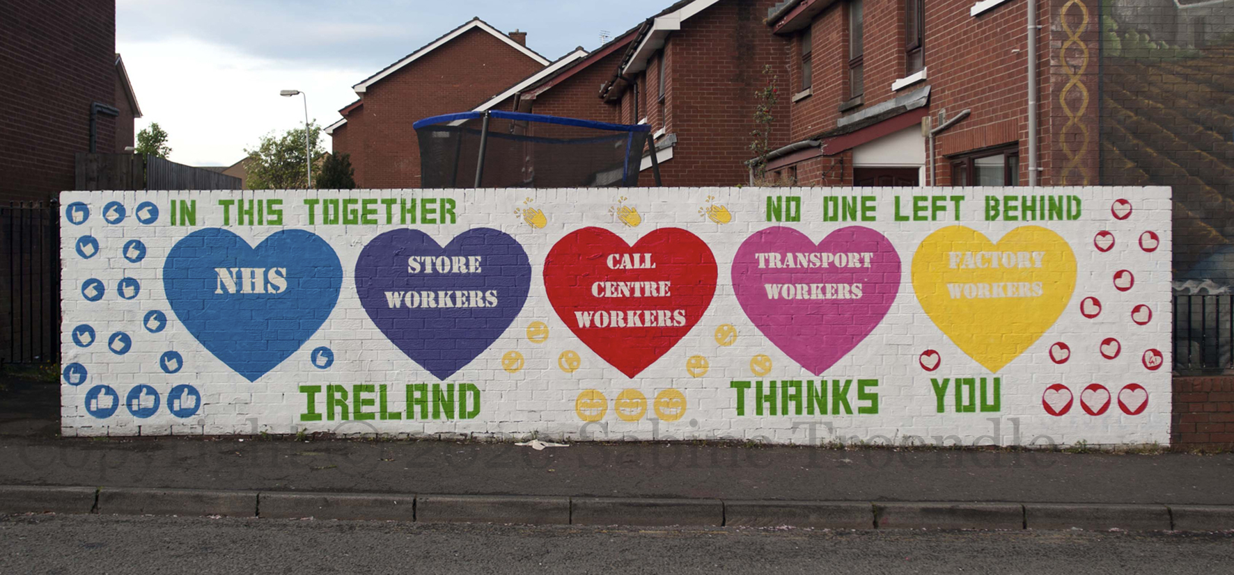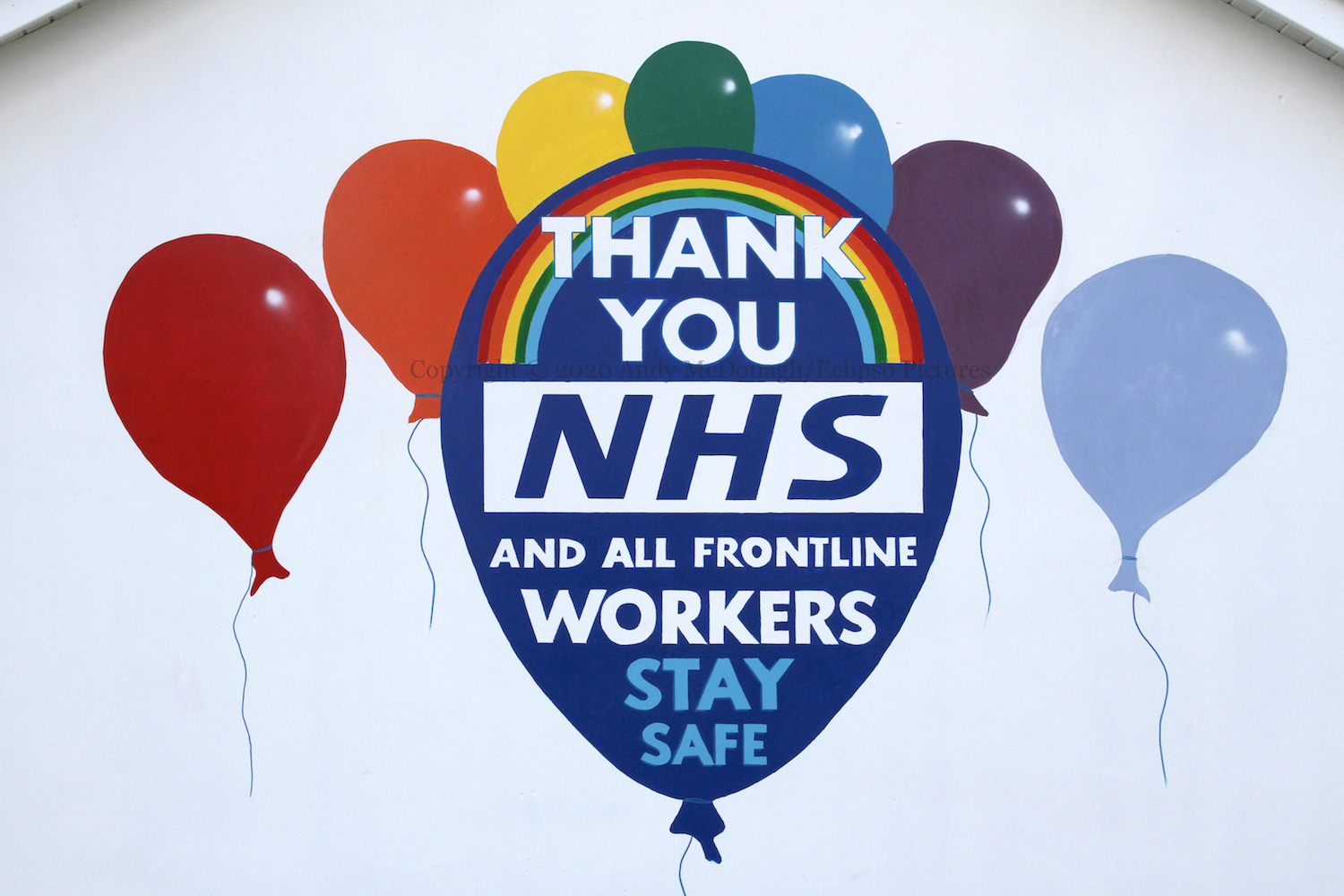 Three of the six Marines who raised an American flag on Iwo Jima in February 1945 – made famous by a photograph Joe Rosenthal – were killed in the battle. The soldiers in this new Glynn mural are planting the flag (a real flag) into a mass of coronavirus molecules, hopefully protected by their surgical masks and gloves. “NHS heroes. Sending a <heart> to all our key workers.”