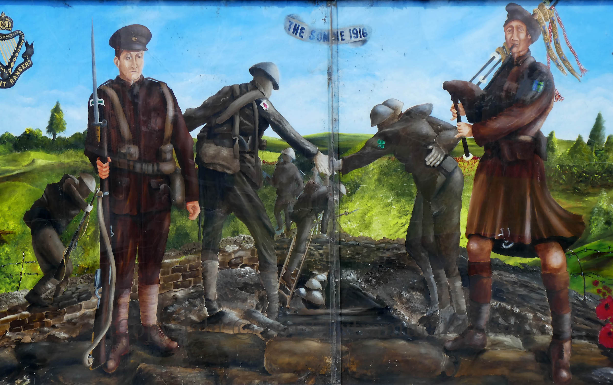 Of the icons along the top, we see from left to right: Scrabo Tower; the red hand of the 36th; the green bar badge of the 10th (Irish) Division; the harp of the Connaught Rangers (battalions of which served in 10th and 16th Divisions); the emblem of the Black Watch – Royal Highlanders (the piping soldier right of centre wears a tartan patch of the Black Watch); the shamrock of the 16th (Irish) Division; the Maid Of Erin harp of the Royal Irish Rifles; Helen’s Tower/Thiepval Tower. It’s not clear why the Black Watch is included, as its battalions do not seem to have served with any of the 10th, 16th, or 36th and is a Scottish regiment rather than an Irish one. Please comment/get in touch if you can explain.