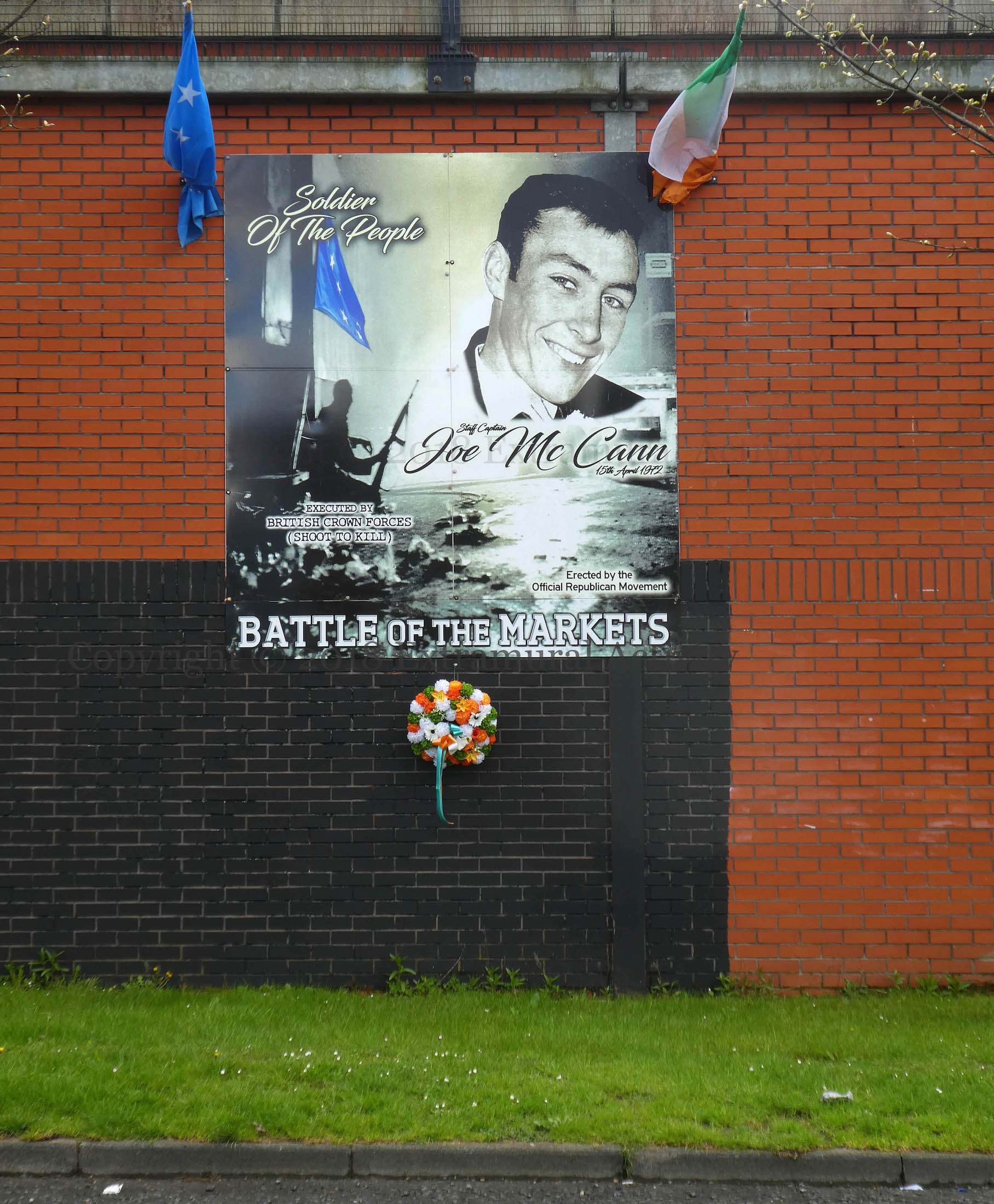 Internment (imprisonment without trial) was introduced on August 9th, 1971 by NI Prime Minister Brian Faulkner, with 342 people arrested on the first day. The Bogside was “hysterical with hated”, according to Eamonn McCann (History Ireland) and of Belfast Kevin Myers wrote “Insanity seized the city.” Two dozen people would die in the rioting and gun-battles that followed, leading to the suspension of Stormont rule (WP). In the Markets area, OC Joe McCann and other (Official) IRA volunteers took over the Inglis bakery and reportedly prevented 600 British troops from entering the area – the image to the left of the board above is a Ciaran Donnelly photograph showing McCann during the battle, kneeling beneath a Starry Plough and holding an M1.