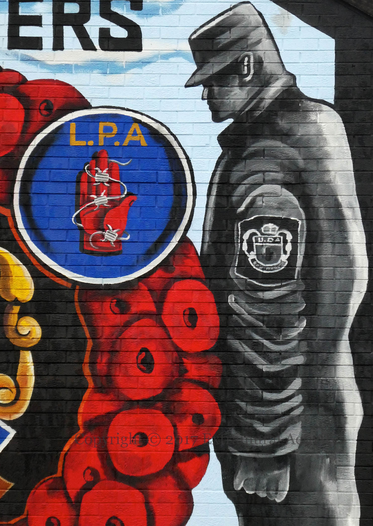 “‘A’ Battalion Sandy Row remembers” fellow members of the South Belfast Brigade. The use of poppies in UDA murals is unusual, as it is the Ulster Volunteer Force that shares its name with the Ulster Volunteers who fought in WWI as the 36th (Ulster) Brigade.