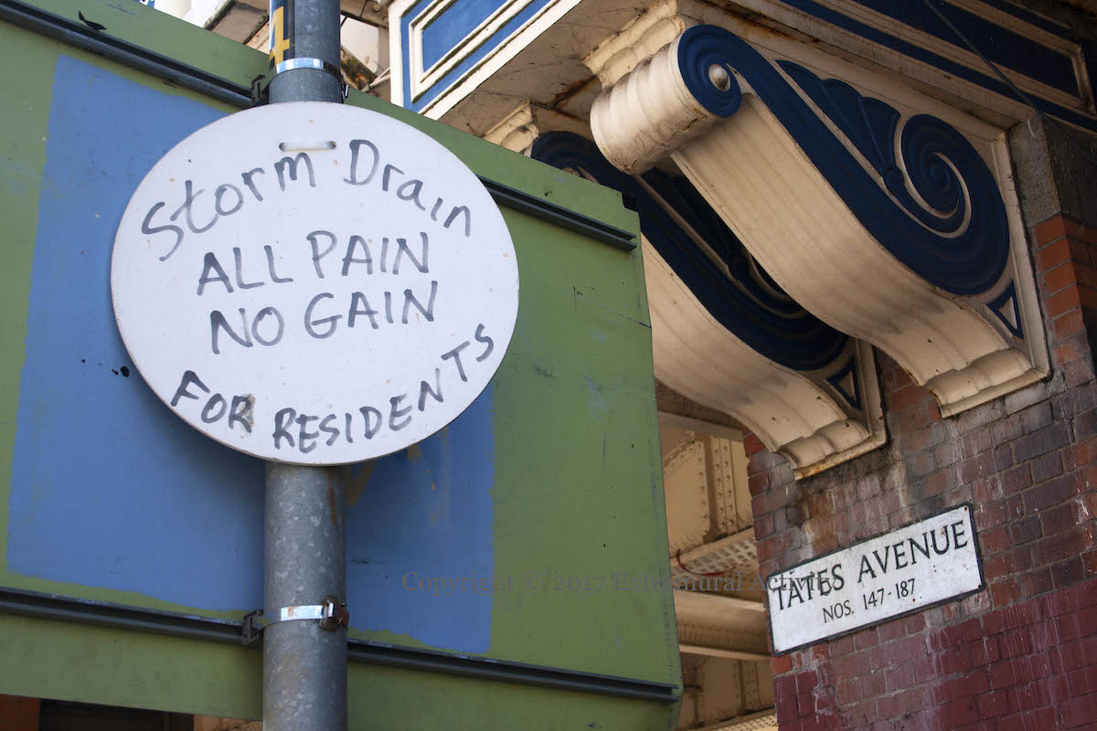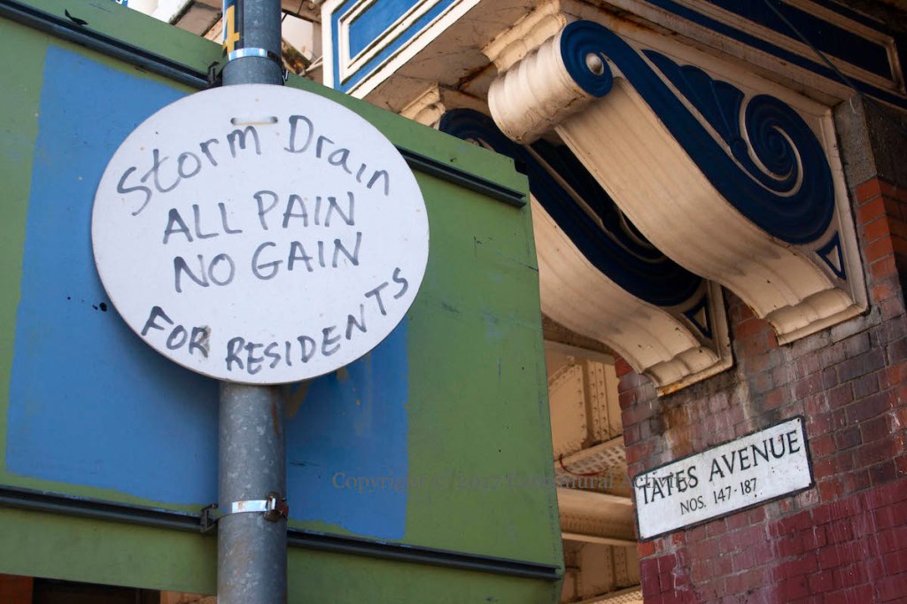 “Storm drain – all pain, no gain for residents”. This is perhaps a reference to the major construction project needed to provide drainage for Windsor Park and the Olympia leisure centre – see Water Projects for images of Donegall Avenue and Olympia Avenue during the work.