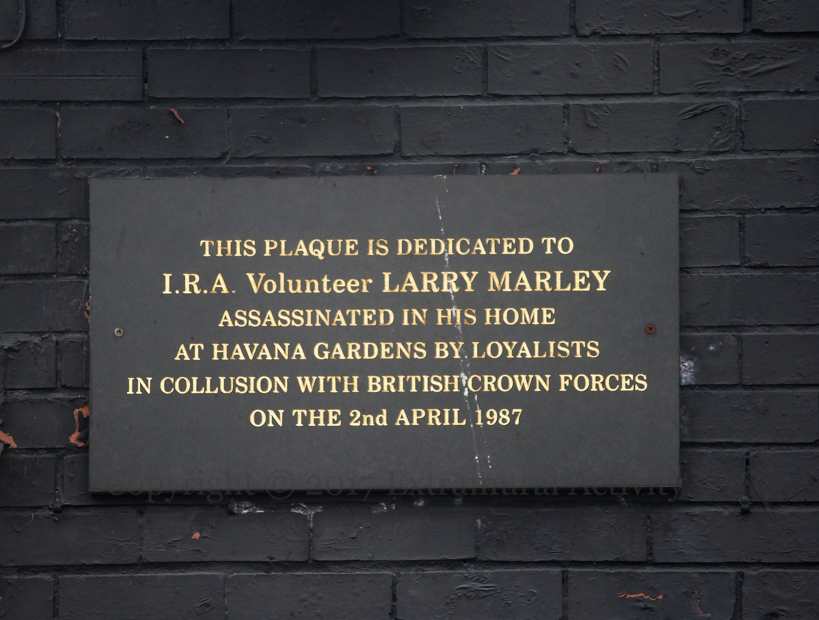 Saoradh (Fb) tarp in Ardoyne with scenes of protest, including a placard reading “Sinn Fein, SDLP, Catholic church silence”. The tarp is next to the plaque for IRA volunteer Larry Marley (shown below), whose protracted funeral meant scenes from Ardoyne being broadcast worldwide.