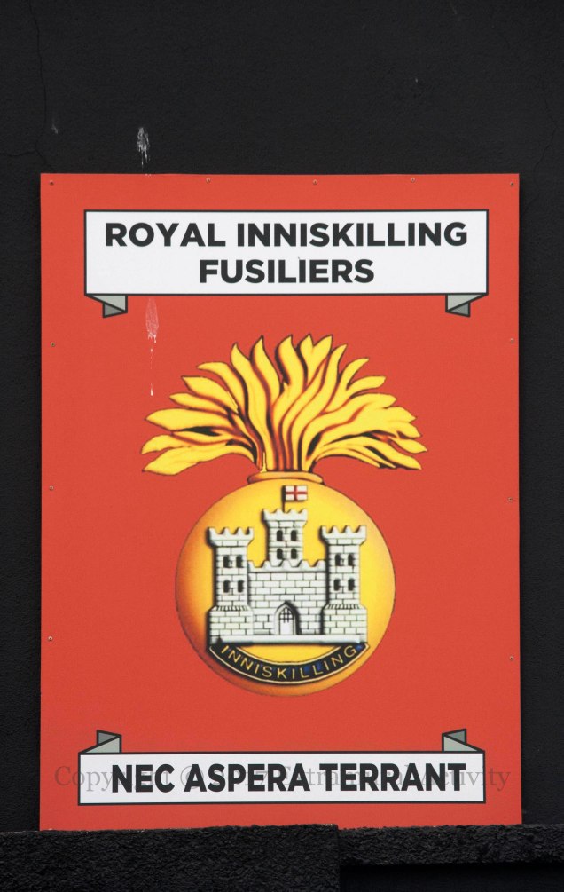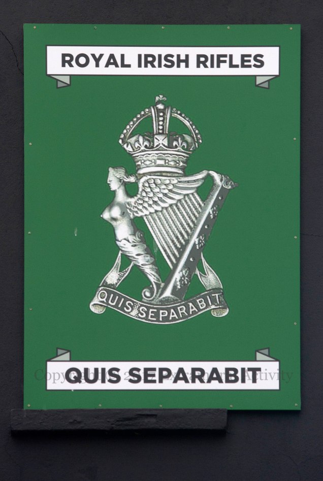Close-ups of the four regimental insignia are included below. “Nec Aspera Terrant [sic, for “terrent”]”, meaning “frightened by no difficulties”, was the motto of the Inniskilling Fusiliers, who fought in both Boer Wars and both World Wars – its battalions saw action at Gallipoli and on the Western front – before being amalgamated in the Royal Irish Rangers in 1968, along with the Royal Ulster Rifles and the troop featured in the third image, the Royal Irish Fusiliers. Their arms are shown along with those of the Royal Irish Rifles and a board commemorating the charge from Thiepval Wood during the Somme