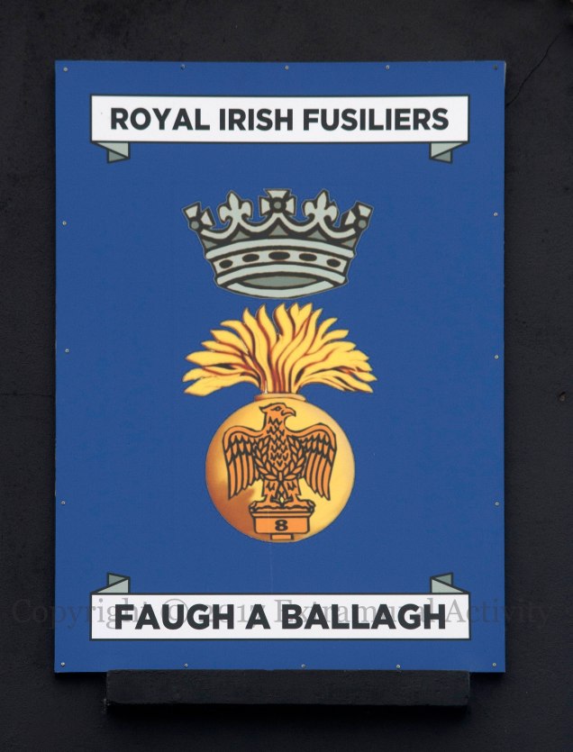 “Faugh a ballagh” (Clear the way) was the motto of the Royal Irish Fusiliers (and then of the Royal Irish Rangers and currently of the Royal Irish Regiment). The Fusiliers served on the western front during WWI – the first and ninth battalions serving in the 36th (Ulster) Division – and the 3rd battalion helped put down the Easter Rising in 1916. Its coat of arm are one of four panels along with the 36th, the Royal Irish Rifles, and the Royal Inniskilling Fusiliers.