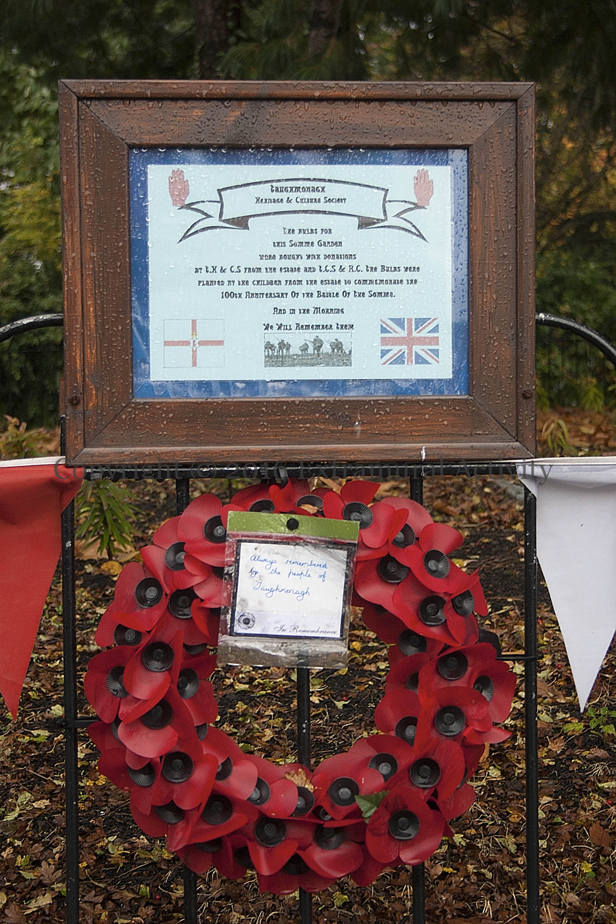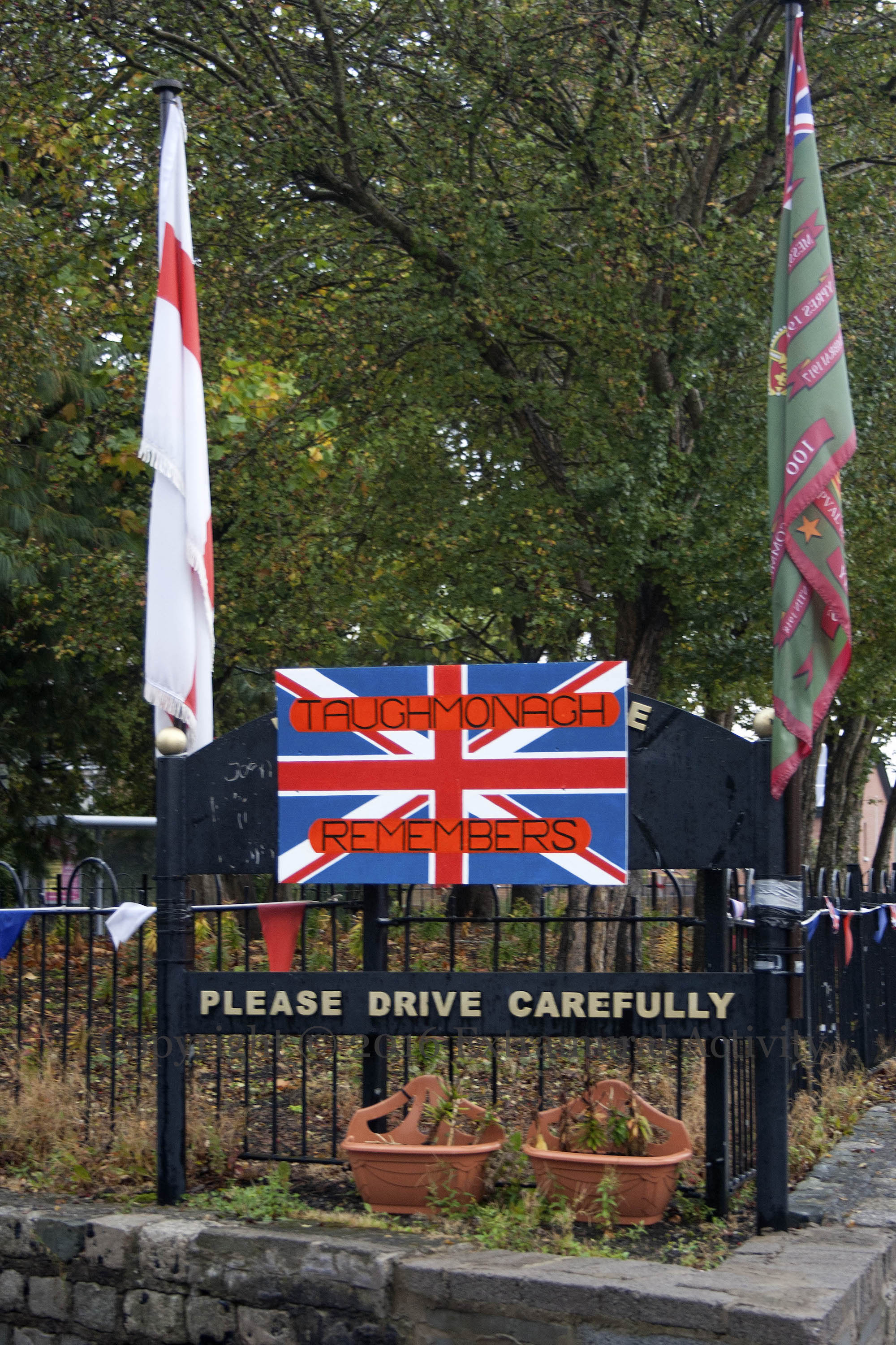 The bus turnaround at the entrance to Taughmonagh estate has been turned into a Somme Garden (see the third image, below). The “Welcome to Taughmonagh” sign at entrance has been covered over with a Union flag board with “Taughmonagh remembers” and the three figures in the sculpture in the middle have each been given a union jack cap.