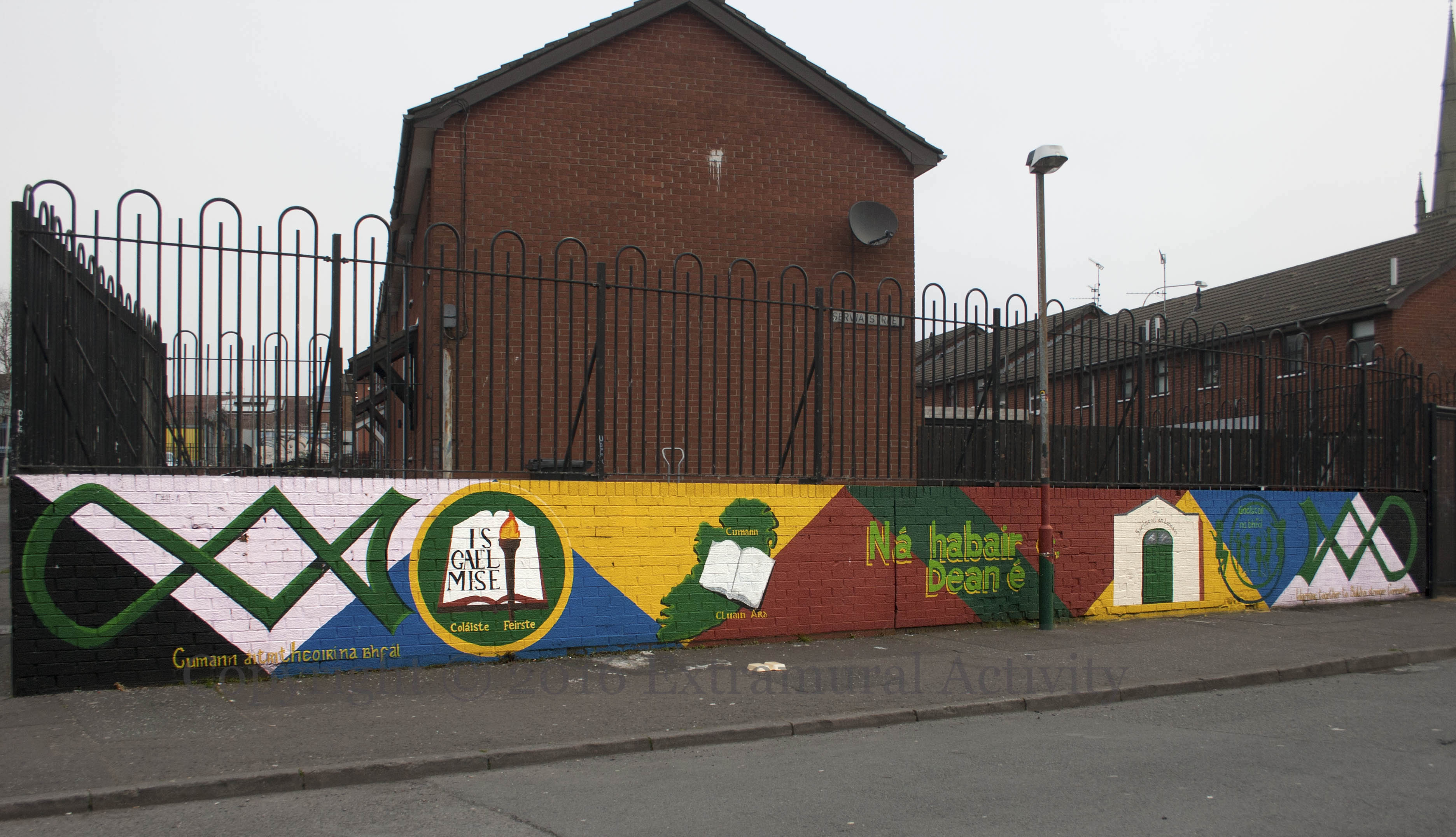 Loyalist paramilitary flags went up in the Skegoneill area of north Belfast last week and drew the response above. The area is mixed (Catholic, Protestant) and the adjacent Glandore area is Catholic.