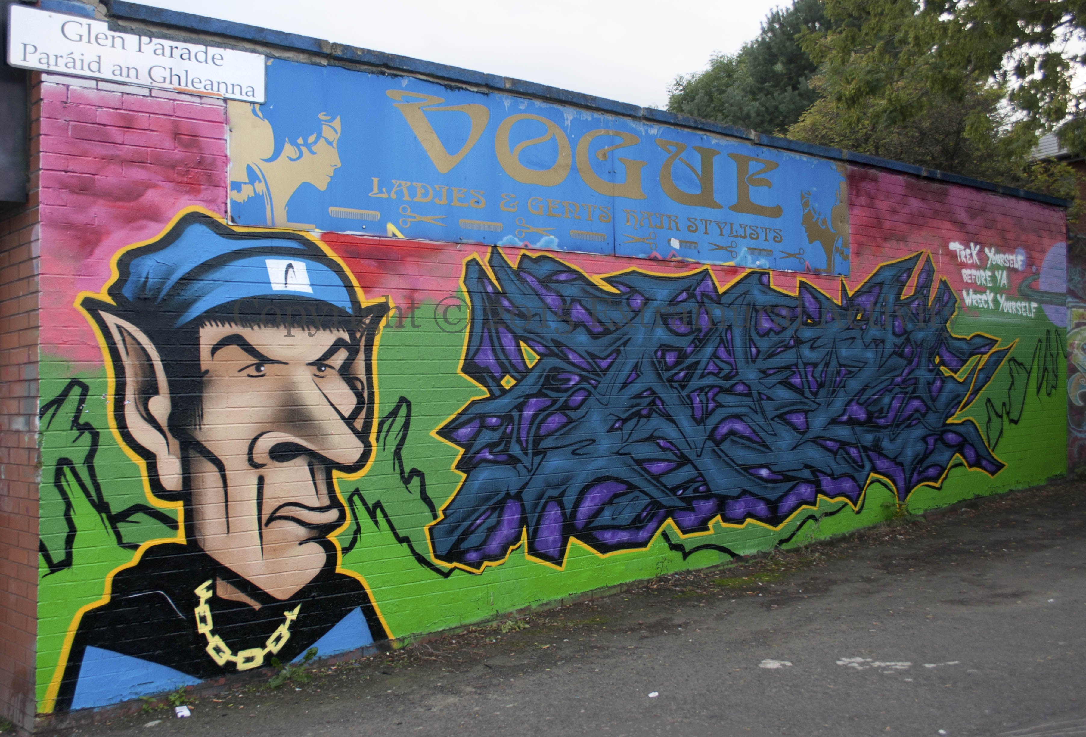Actor Leonard Nimoy died on February 27th, 2015. He is best known for the role of Star Trek‘s Spock, a part he played for 49 years. The mural above brings the character from space to the streets, with gold chain and skull hat. “Trek yourself before ya wreck yourself.”