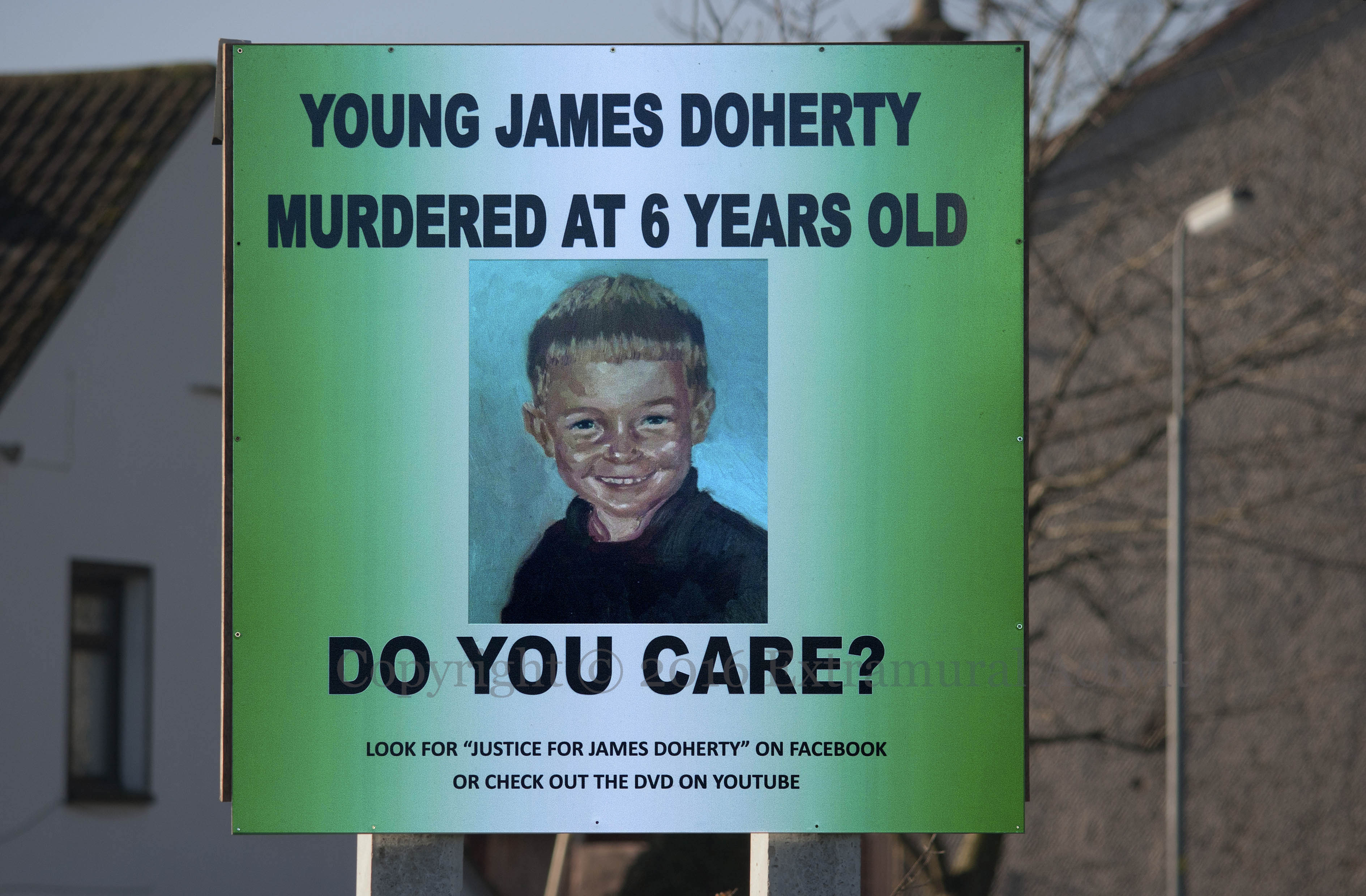 James “Jim” Doherty was six years old when he was shot while playing in the front garden of his Turf Lodge home in 1972. Relatives For Justice and the family launched the board shown above at the entrance to the estate last October in order to push for a new inquiry into the death due to the insufficiency of the original investigation and the disappearance of the bullet taken from the body. (Belfast Media Group)