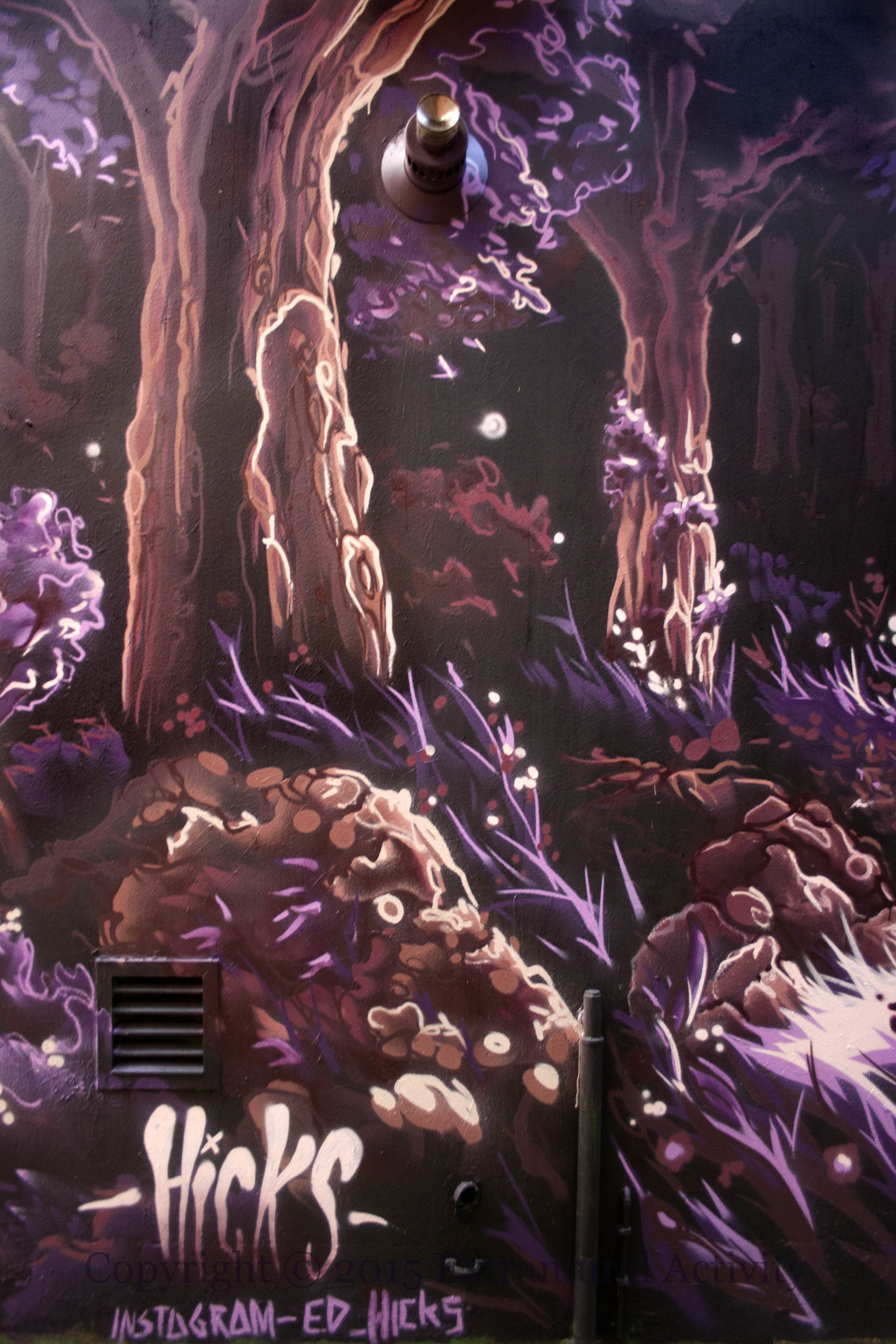 An enchanted forest in purple and gold – street art by London-based artist Ed Hicks (Instagram | Fb) for CNB15. The piece is in a narrow alley (Exchange Place, next to the Black Box) which makes quality images of the whole thing difficult to get – you are encouraged to see the full thing in person.