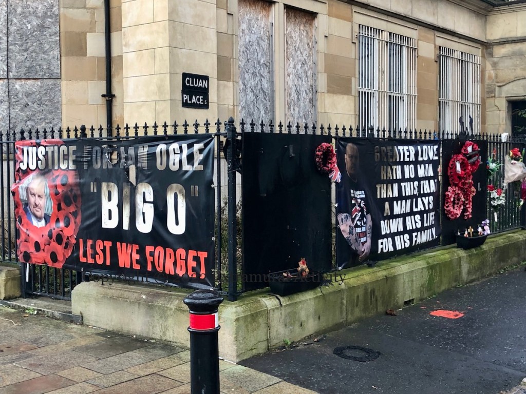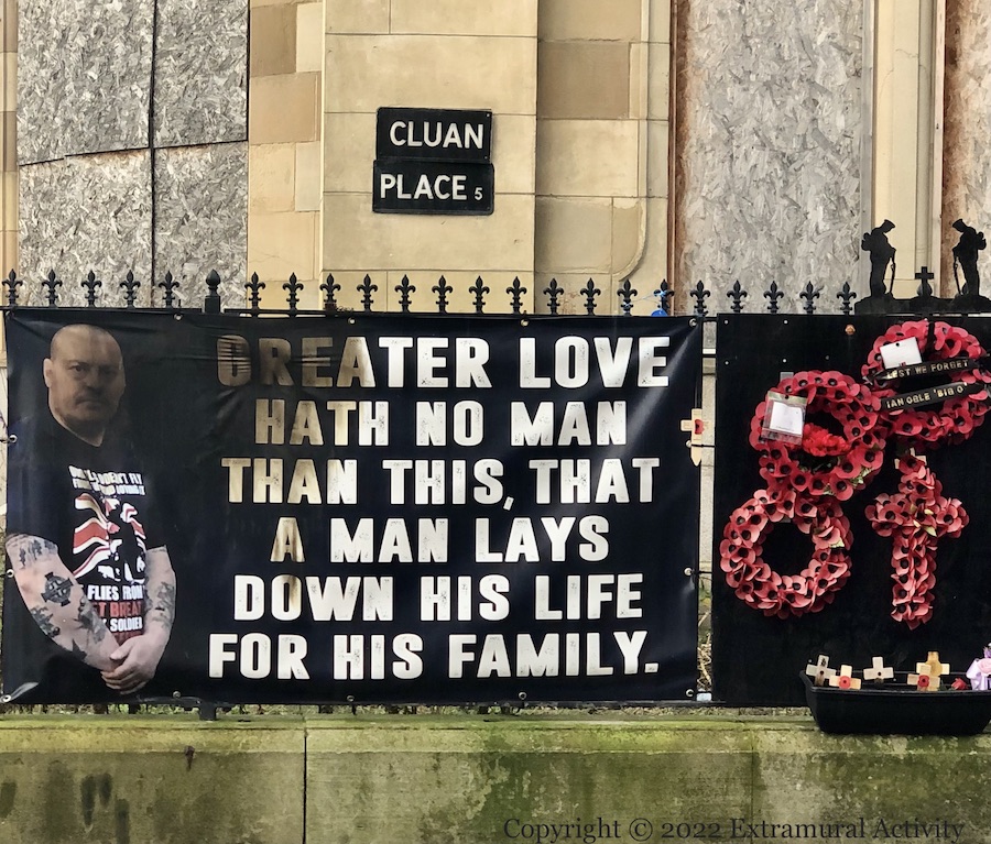 Two Larne trees: above, the tree mosaic at the Town Hall steps created by artist Janet Crymble (see previously Sports We Love), with support from Larne Renovation Regeneration, Larne Trader’s Forum, and Mid & East Antrim Borough Council (NIWorld); below, the “Armada Tree” that is purported to have sprung from a chestnut or chestnut seeds in the pocket of a dead sailor in the Spanish Armada – the tree fell over after 432 years in 2020, a victim of root disease (anglican.org), but is remembered by the board depicting it in Upper Main Street, Larne.