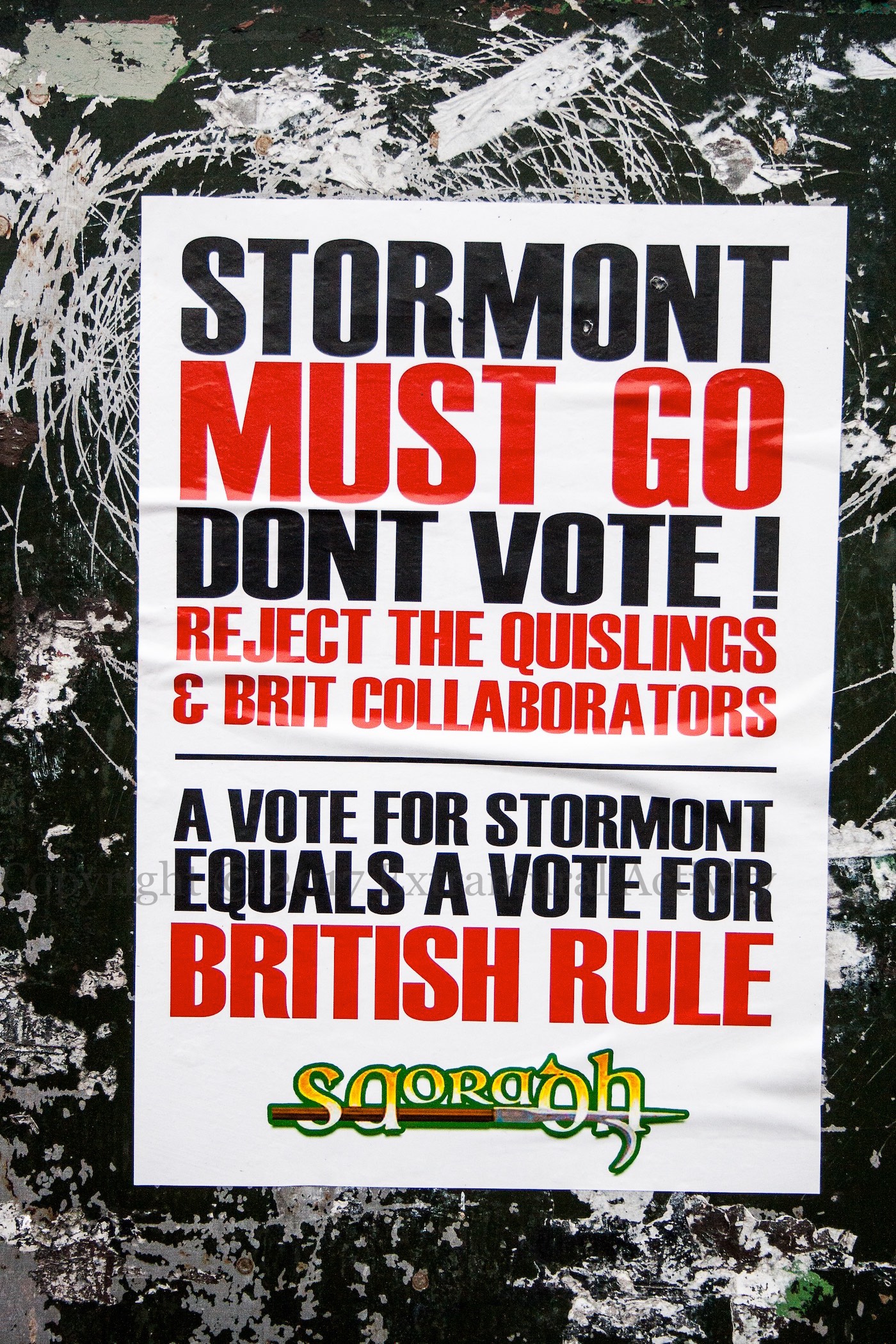 Below, Saoradh’s plea that “A vote for Stormont equals a vote for British rule – Don’t vote! Reject the quislings and Brit collaborators.” (See also: Stormont Must Go)