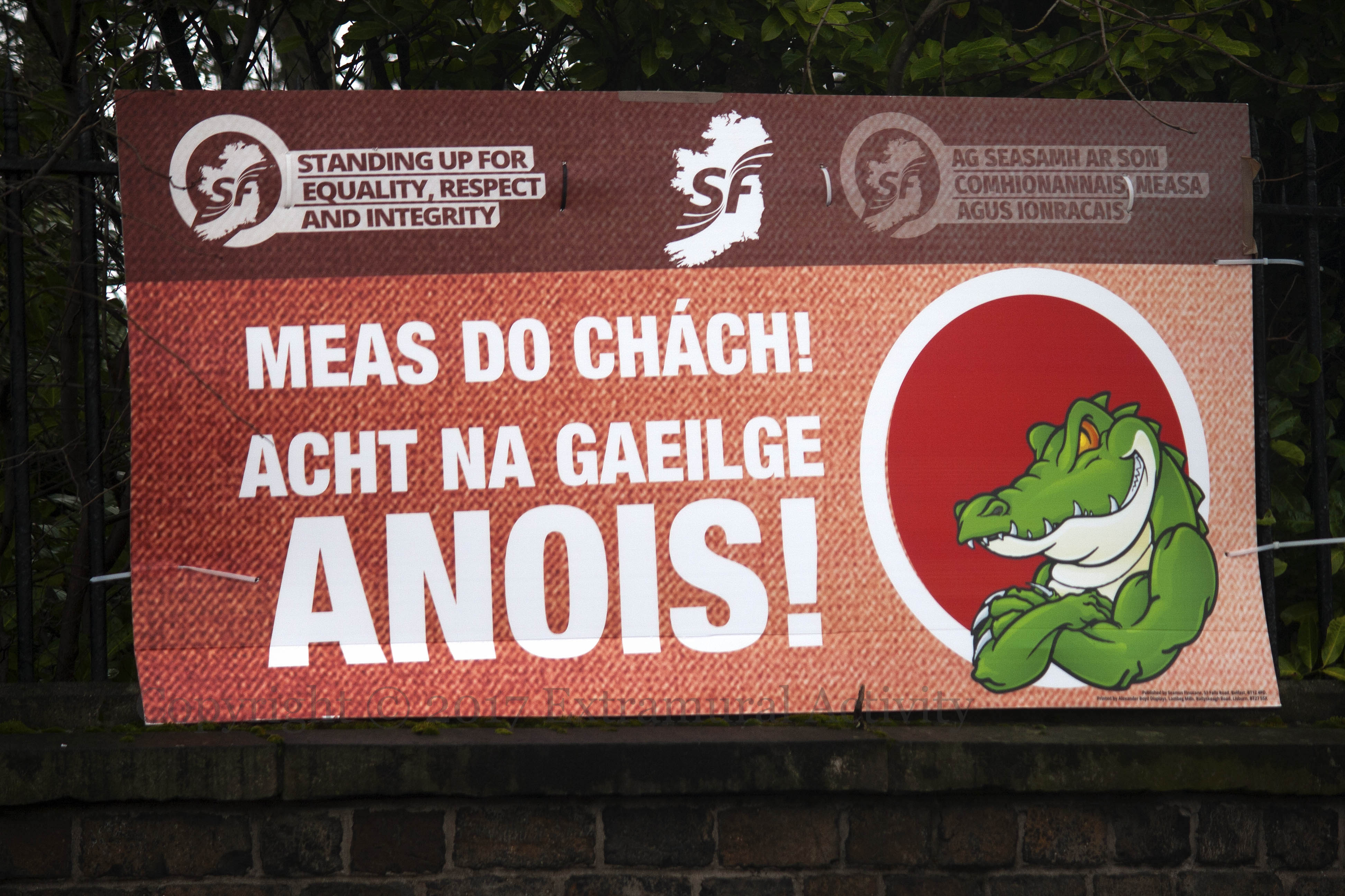 Two final pieces from the #ae17 election campaign. Above, a somewhat menacing crocodile waits impatiently for an Irish-language act: “Meas do chách – Acht na Gaeılge anoıs!” (“Respect for all – Irish language act now!”) The white circle on red is the logo of An Dream Dearg, an Irish-language campaign (Irish News); the crocodile stems from DUP leader Arlene Foster’s response to Sınn Féın demands for an Act, when she said “If you feed a crocodile, they’re going to keep coming back and looking for more.” (BBC-NI | video at RTÉ) She later said she regretted the remarks as they allowed her to be demonised during the campaign (BelTel).
