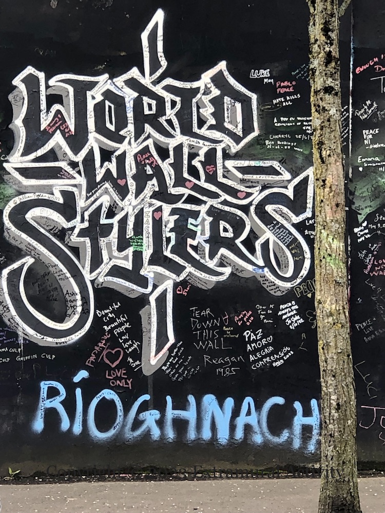 The obscured piece by Bust and the “World Wall Stylers” tag can be seen in better condition in New Levels, Same Devils (2022). “Ríoghnach” is an Irish-language name.