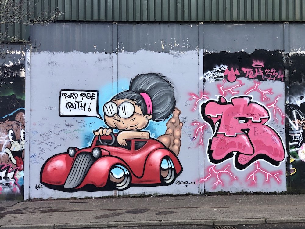 Here are a few pieces from the so-called “peace” line dividing CNR and PUL west Belfast, featuring, above, ‘Road rage Ruth’ by Kilian (ig). Previously by Kilian on the “peace” line: The Brain Is Wider Than The Sky. See also the works done for HTN23, HTN22, and HTN21.