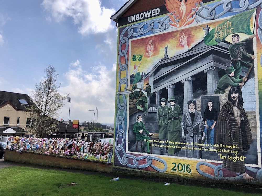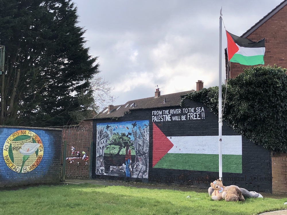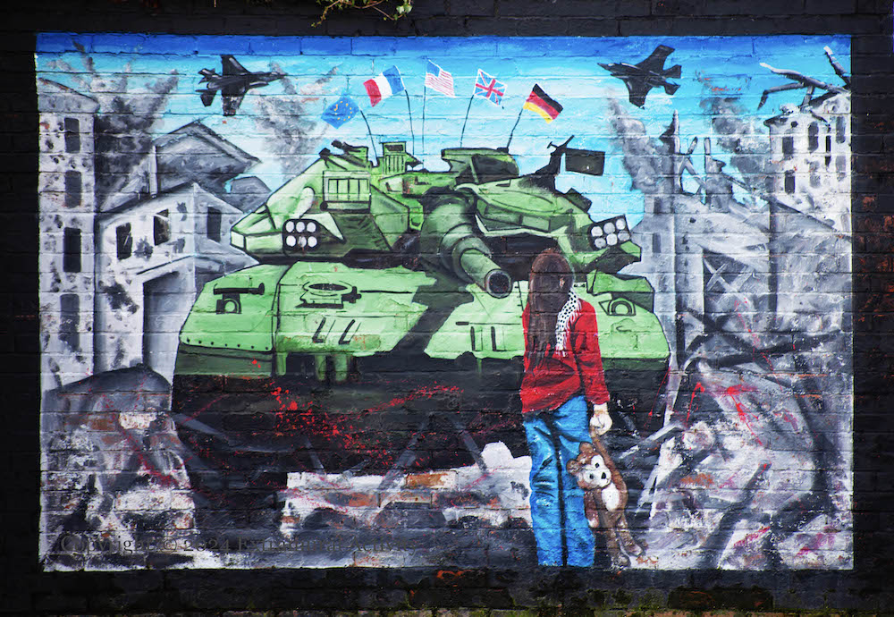 The F-16 jets and rubble and child with teddy-bear are the same as in the We Stand With Palestine mural in Ardoyne.