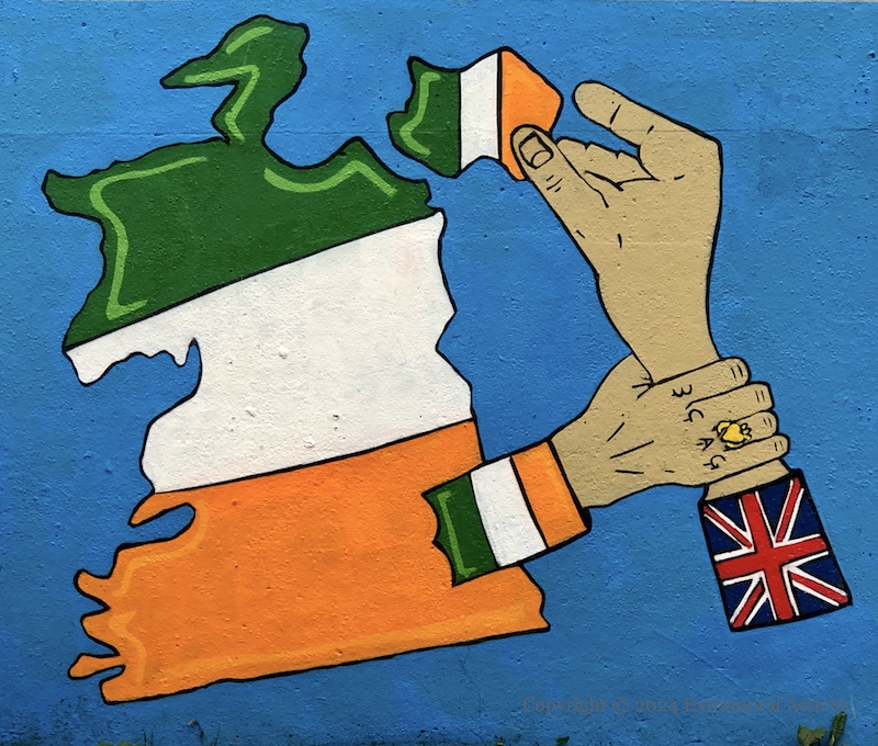 The WHO and UNRWA now estimates that of the 34,000 Palestinians killed in Gaza, about 14,000 were children (Egypt Today). 18 were killed in a single explosion in Rafah yesterday (AP). This new board in west Belfast illustrates the disparity between Israeli forces and ordinary Palestinians by showing children in ragged clothing armed only with a single, odd-looking (AI hallucinated?), slingshot facing off against other children armed with assault rifles and wearing riot gear.
