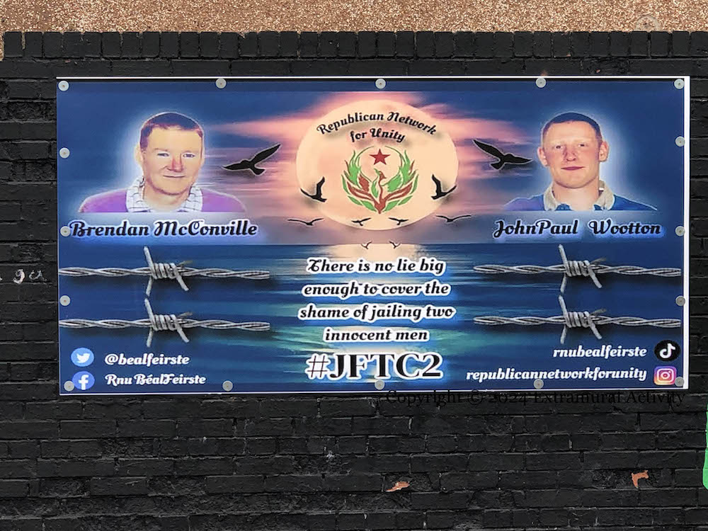 “There is no lie big enough to cover the shame of jailing two innocent men #JFTC2”. Brendan McConville and John Paul Wootton were convicted of the 2009 murder of Constable Stephen Carroll (BBC), and sentenced to life with 25-year and 18-year minimums, respectively. The case is under review (Guardian | An Phoblacht).