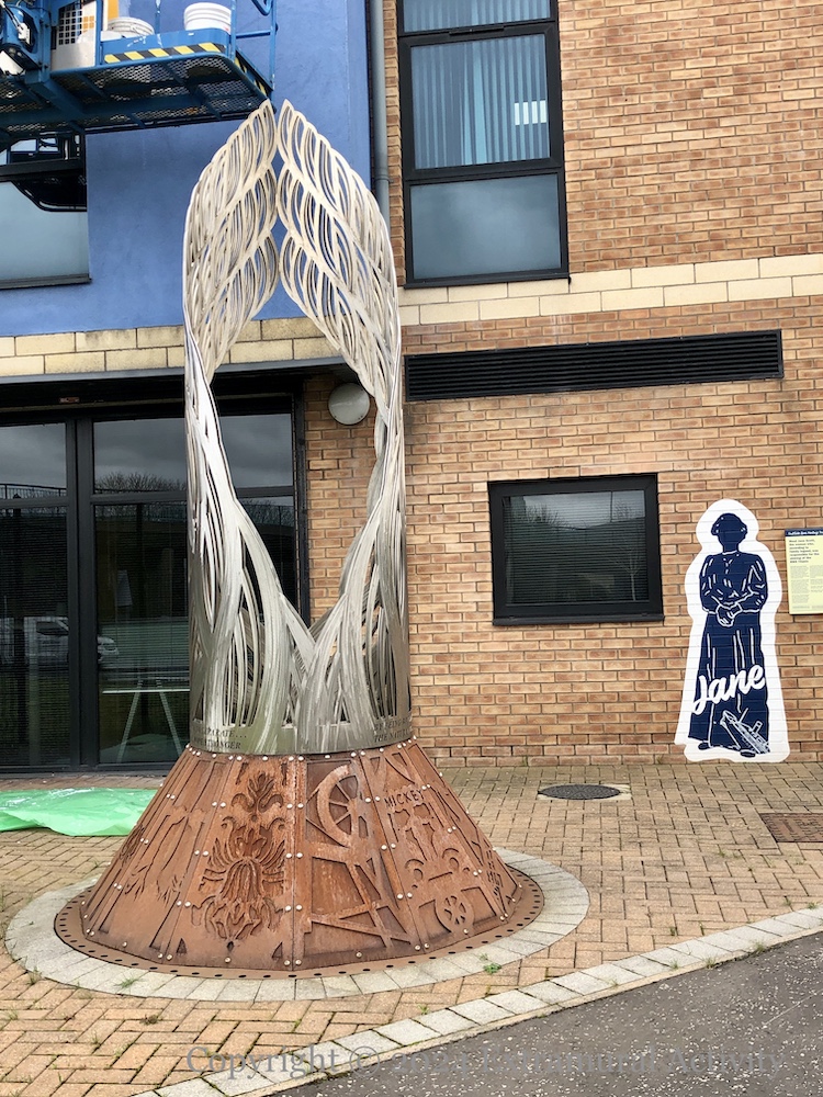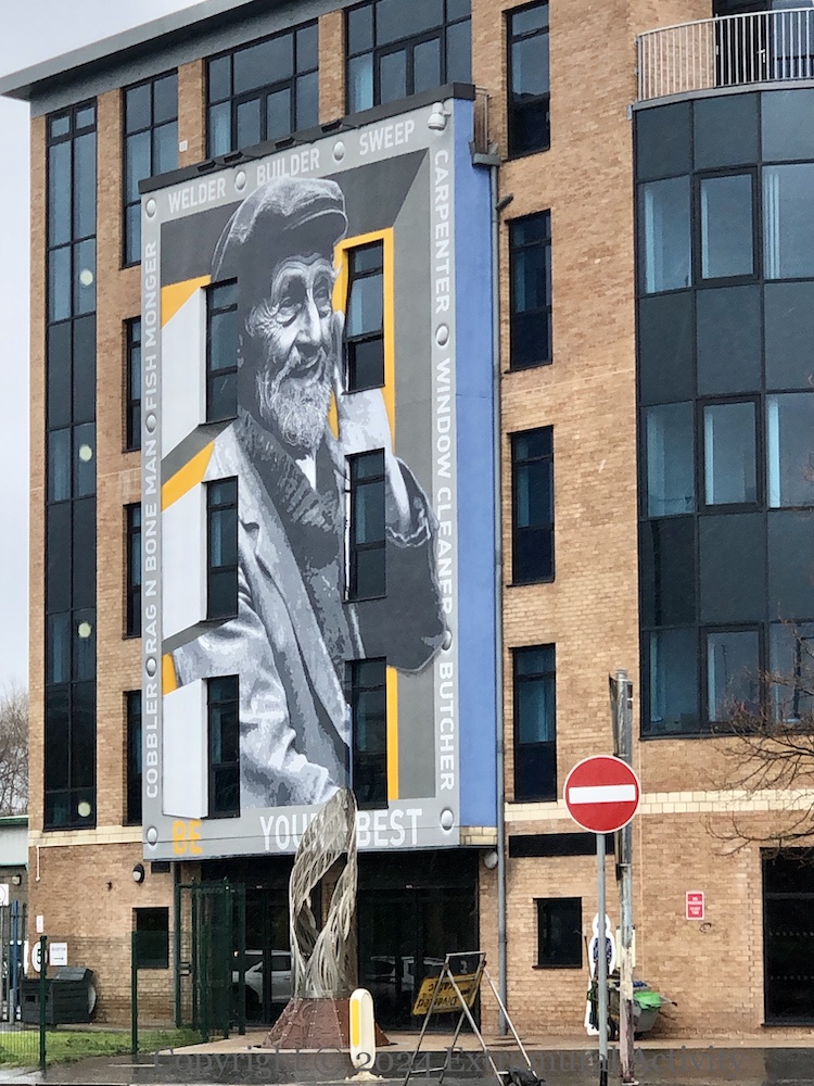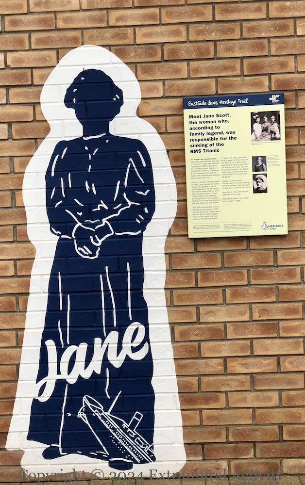 On the wall behind the sculpture and below the mural is one of the Eastside Lives Heritage Trail (pdf) figures, Jane Scott, whose fifteen-year-old son Samuel fell to his death from a ladder while working on the ship in 1910. She supposedly cursed the ship and it sank two years later.