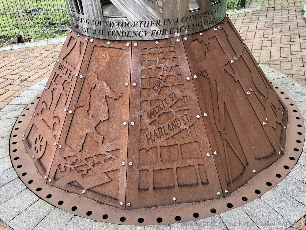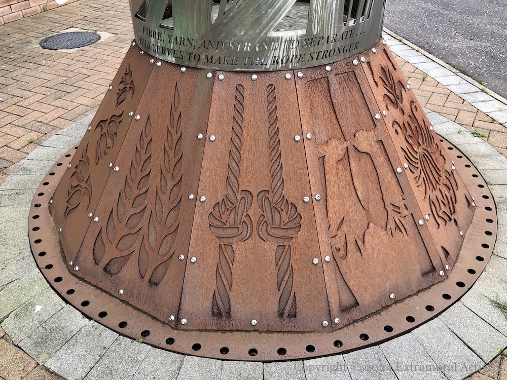 In being overshadowed by the mural, the “Let’s Twist Again” sculpture on the plaza in front of the business centre now becomes a symbol of east Belfast rather than the symbol. It too features east Belfast’s “industrial past” (BelTel), using rope as a metaphor for community: “By being bound together in a common cause, the natural tendency for each twist, fibre, yarn, and strand to separate, only serves to make the rope stronger.”