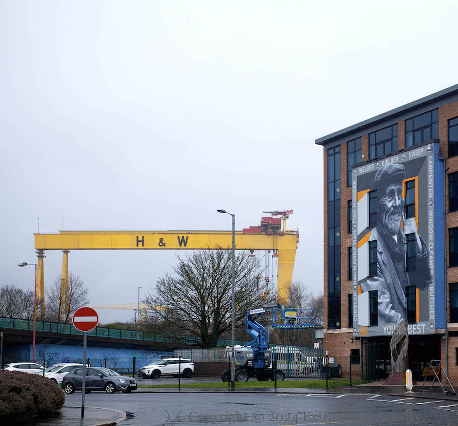 This new three-storey mural by Dee Craig (Fb) is at the city end of Newtownards Road and so serves as a highly-visible introduction to east Belfast. People arriving in the area are now greeted with a vintage image of a smiling bearded man in a cloth cap, surrounded by occupations from the industrial era: “Cobbler, rag’n’bone man, fish monger, welder, builder, sweep, carpenter, window cleaner, butcher”, capped off by an inspirational “Be your best”, with yellow highlights that match the colour of the shipyard cranes Samson and Goliath (see the third image).