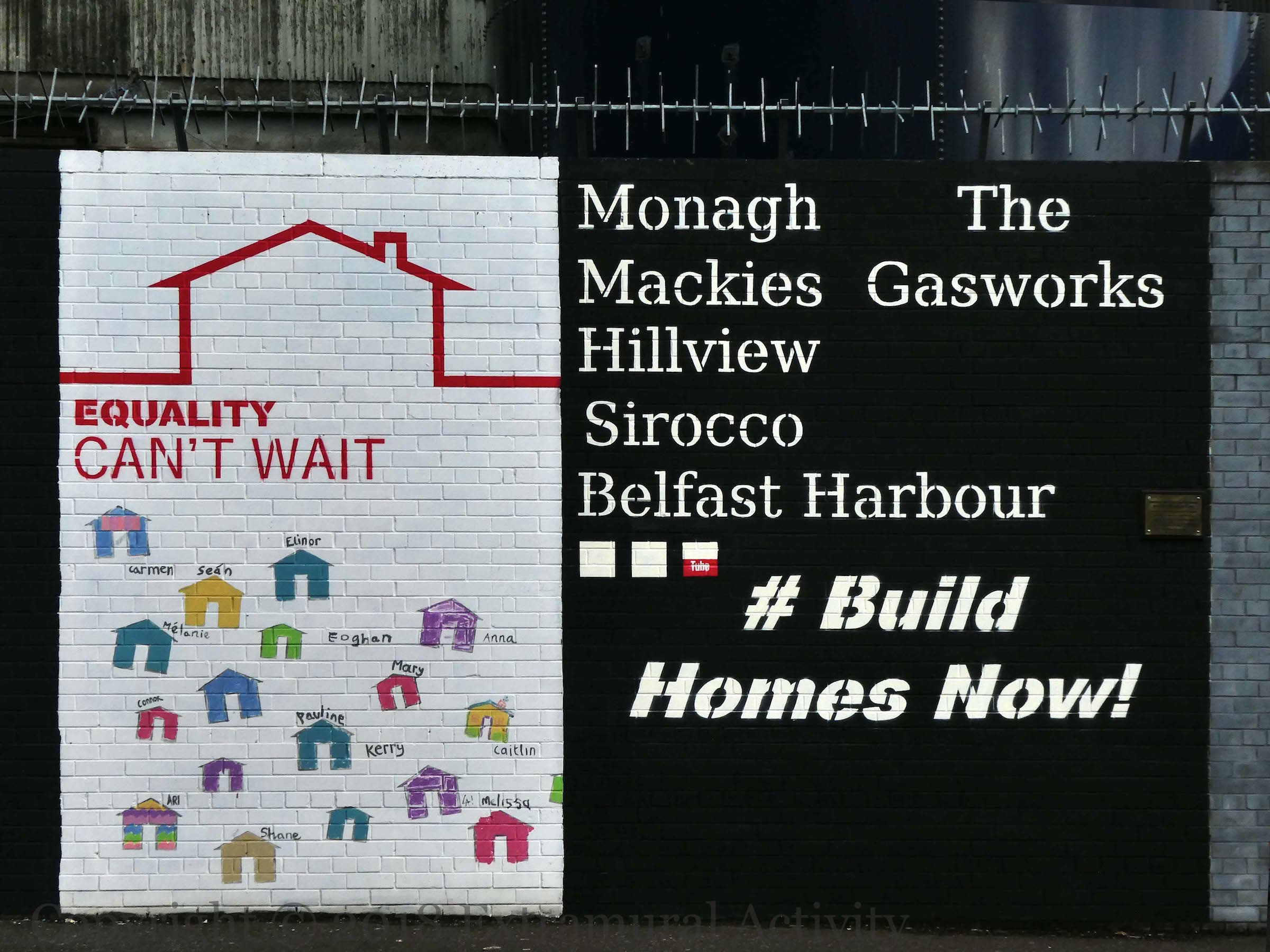 The evolution of the #BuildHomesNow mural on Northumberland Street continues with a list of sites that PPR (Participation & the Practice of Rights tw | web) thinks suitable for building homes: Monagh, the Gasworks, Mackies, Sirocco, Belfast Harbour. Previous versions: June 2016 | January 2017.