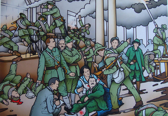 This next version is not a mural but Robert Ballagh’s 2012-09 limited-edition print which was produced as a fundraiser to repair the memorial to the Easter Week Volunteers in Glasnevin Cemetery, Dublin (History Ireland).