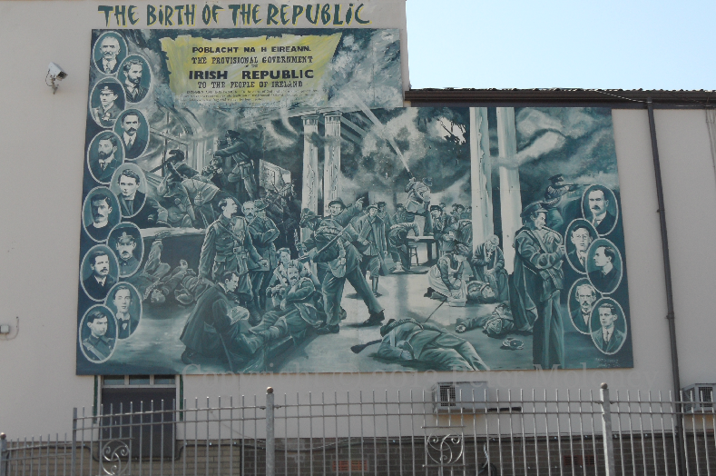 This last version – which uses the proclamation and Tricolour as a background – was painted for the travelling exhibition of Easter Rising memorabilia that included a stop at the PD club in Andersonstown.