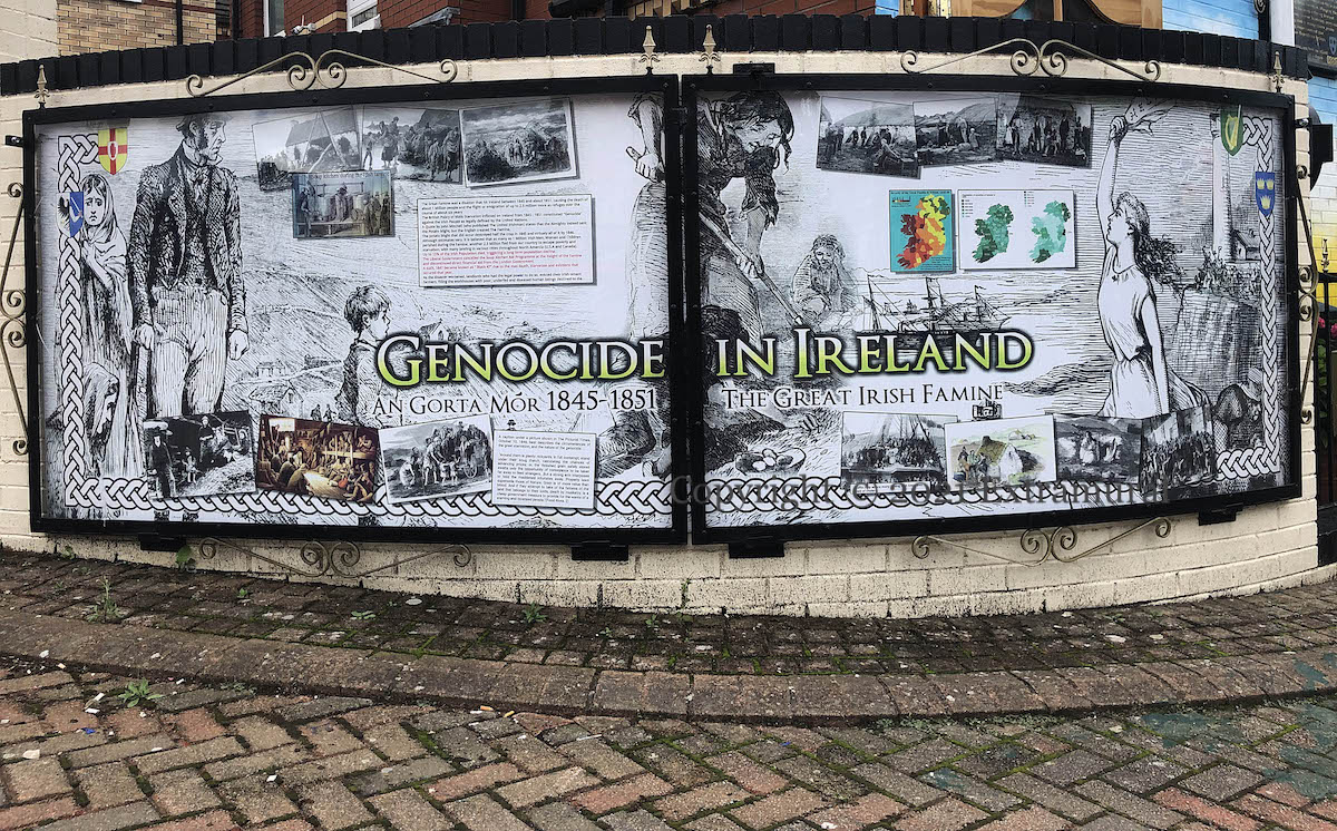 2021 “Genocide In Ireland” in Ard An Lao, Belfast. Including (left): Family Being Evicted From Their Home In Rural Ireland, (centre) Searching For Potatoes In A Stubble Field (ILN), and (right) food arriving from the USA in the famine of 1879-1880.