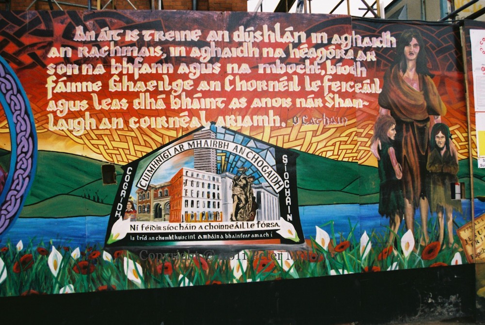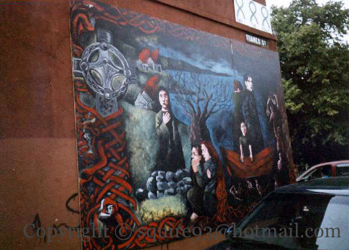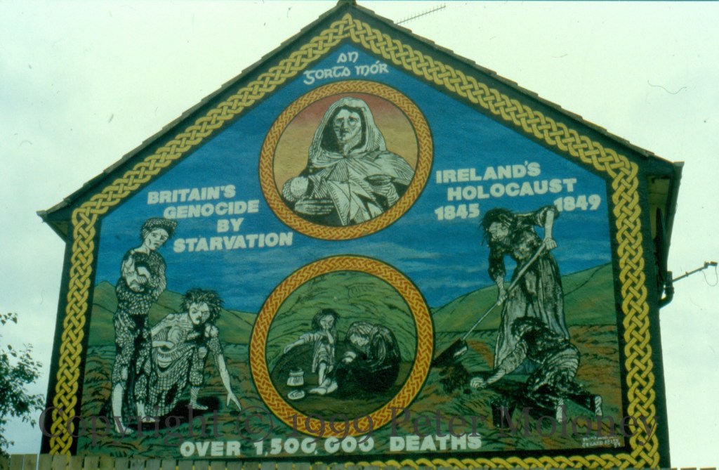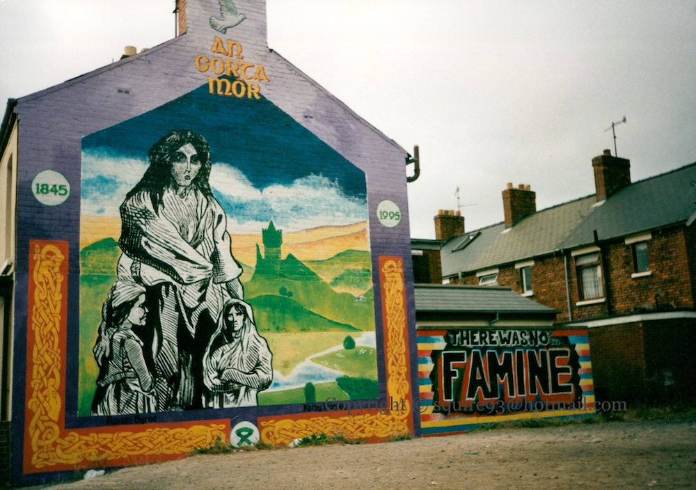 1995 “Nature sent the potato blight, government & landlords created the famine” in Lenadoon Avenue (painted by a Short Strand artist and Cormac)