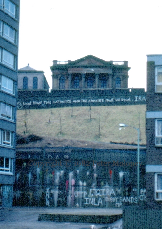 “God made the Catholics and the Armalite made us equal. IRA.” on the walls of Derry, as viewed from the front of Rossville flats. With FTQ, IRA, INLA, UTP, and “Bobby Sands MP” graffiti below.